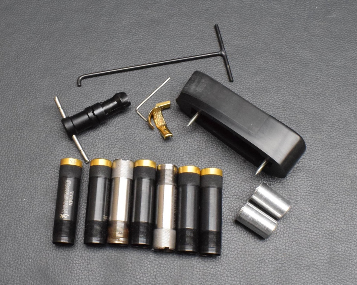 Mit 7 Wechselchoke, Schaftkappe zum wechseln, 2 Pufferpatronen, 2 Abzugszüngel und Werkzeug.