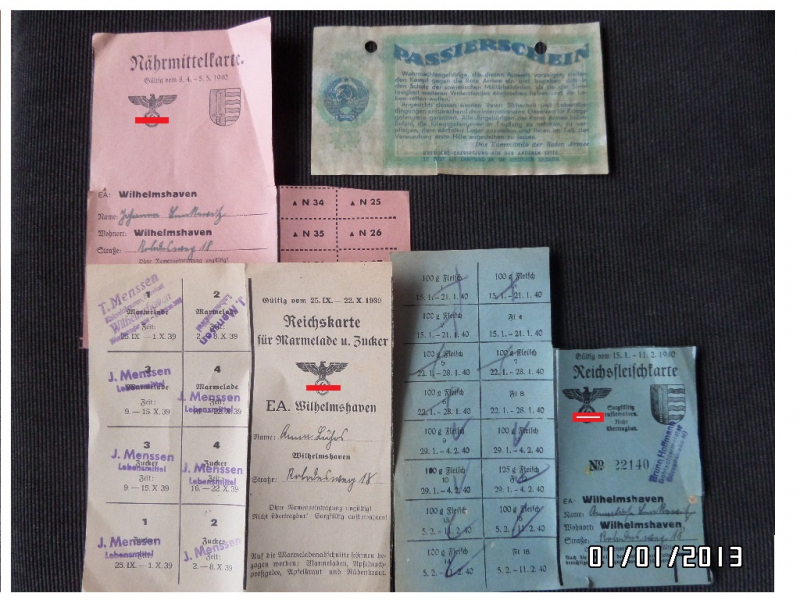 Lebensmittelkarten 1939-1940 und Sowjetisches Flugblatt mit "Passierschein" an die