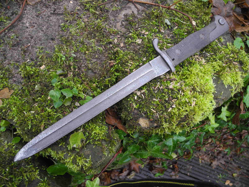 Die Griffschalen sind aus Holz. Die Klinge ist 24,5 cm und das gesamte Bajonett ist 38 cm lang.