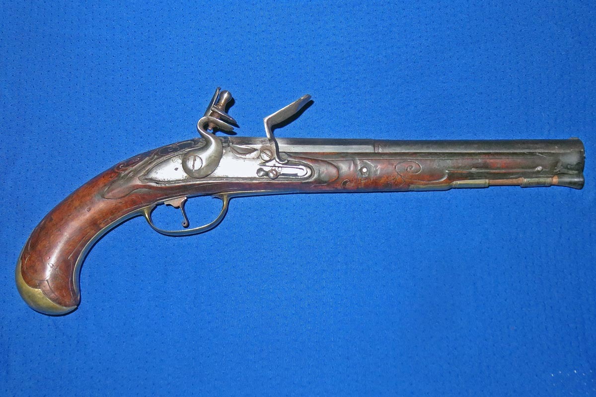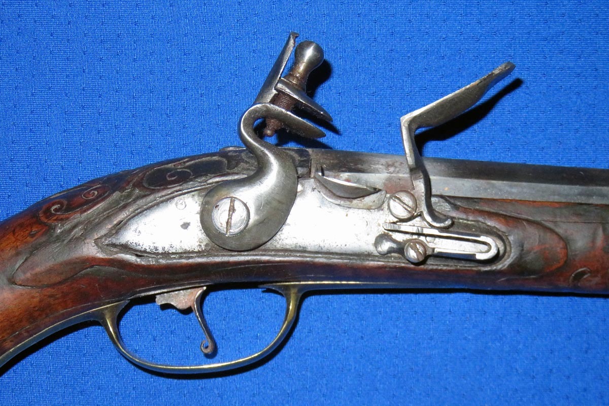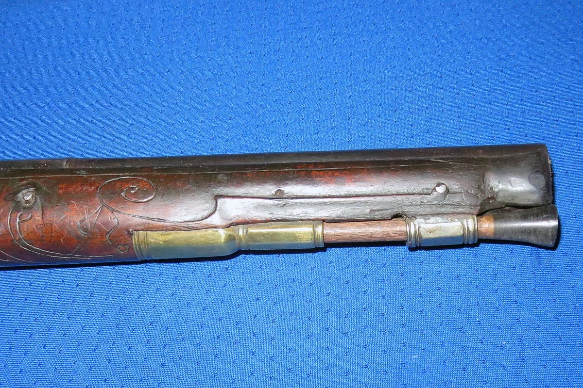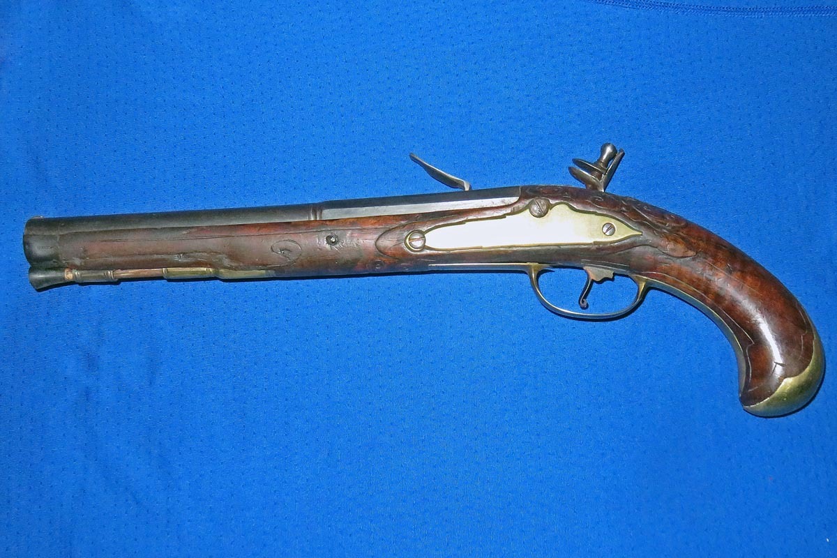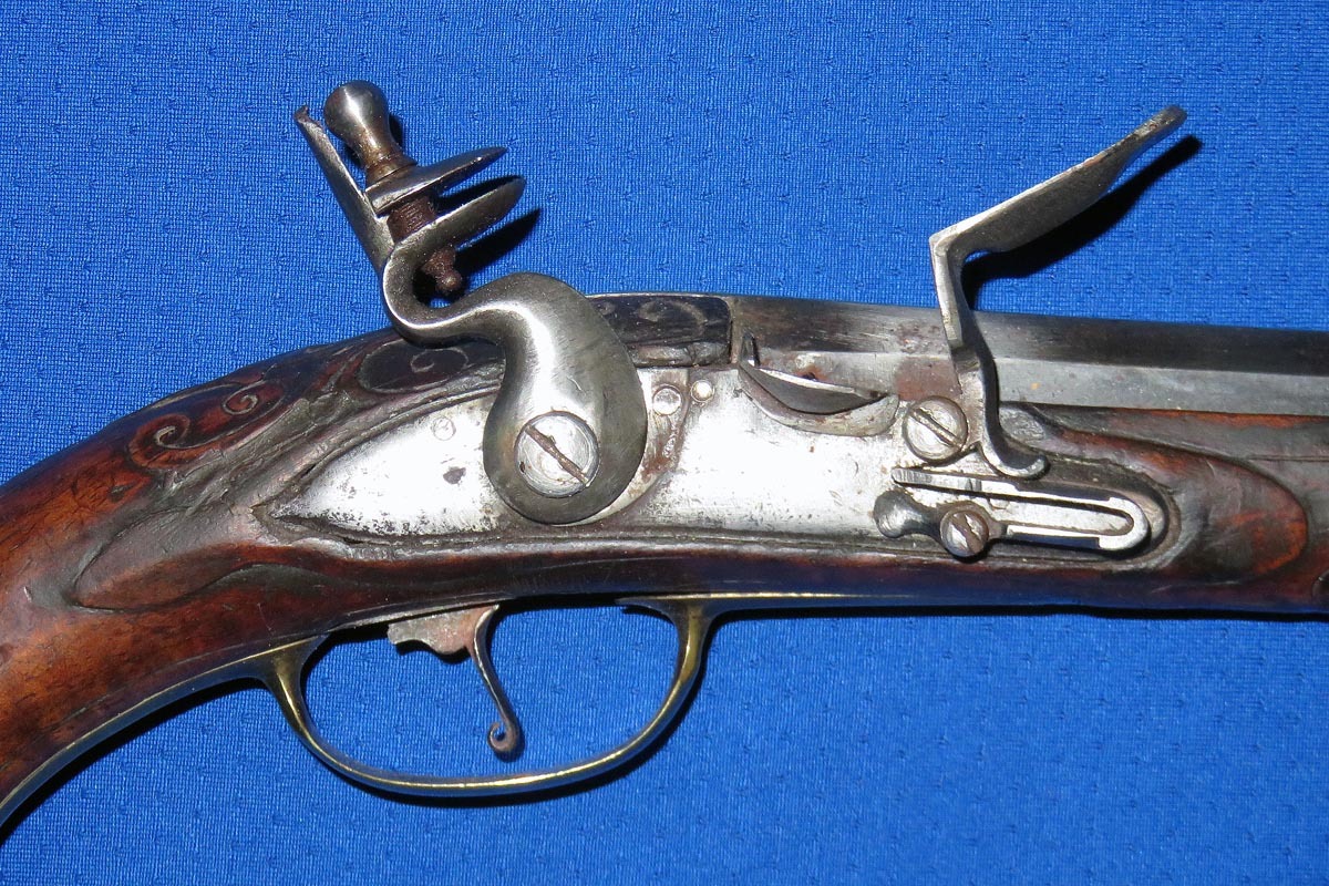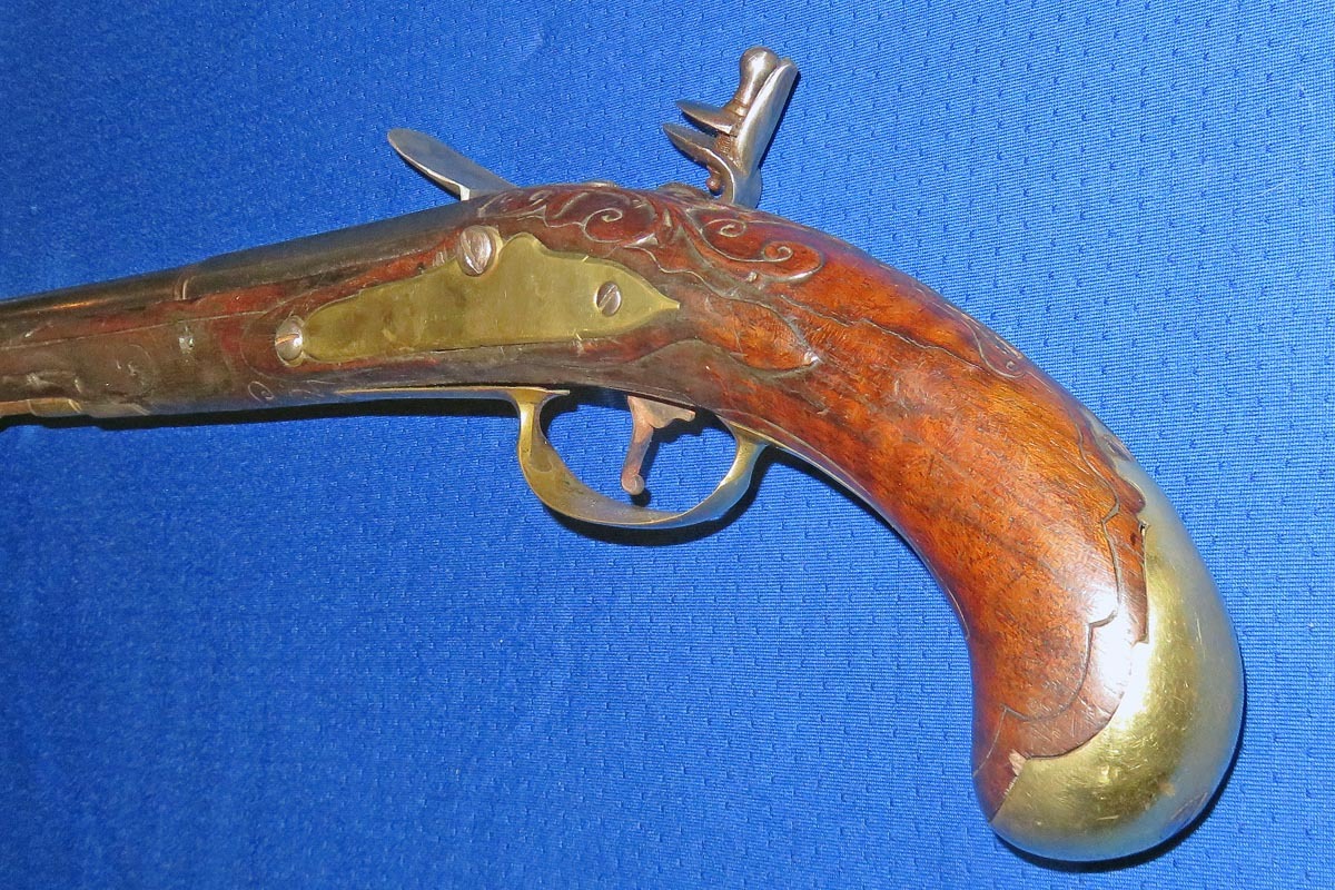 Originale Steinschlosspistole mit hinten achtkantiken nach vorne glatten Rundlauf im Kaliber 14,5 mm, Messingbeschläge, floral verschnittenen Nussbaumschaft, Holzladestock mit Hornabschluss und voll funktionsfähigem Steinschloss.