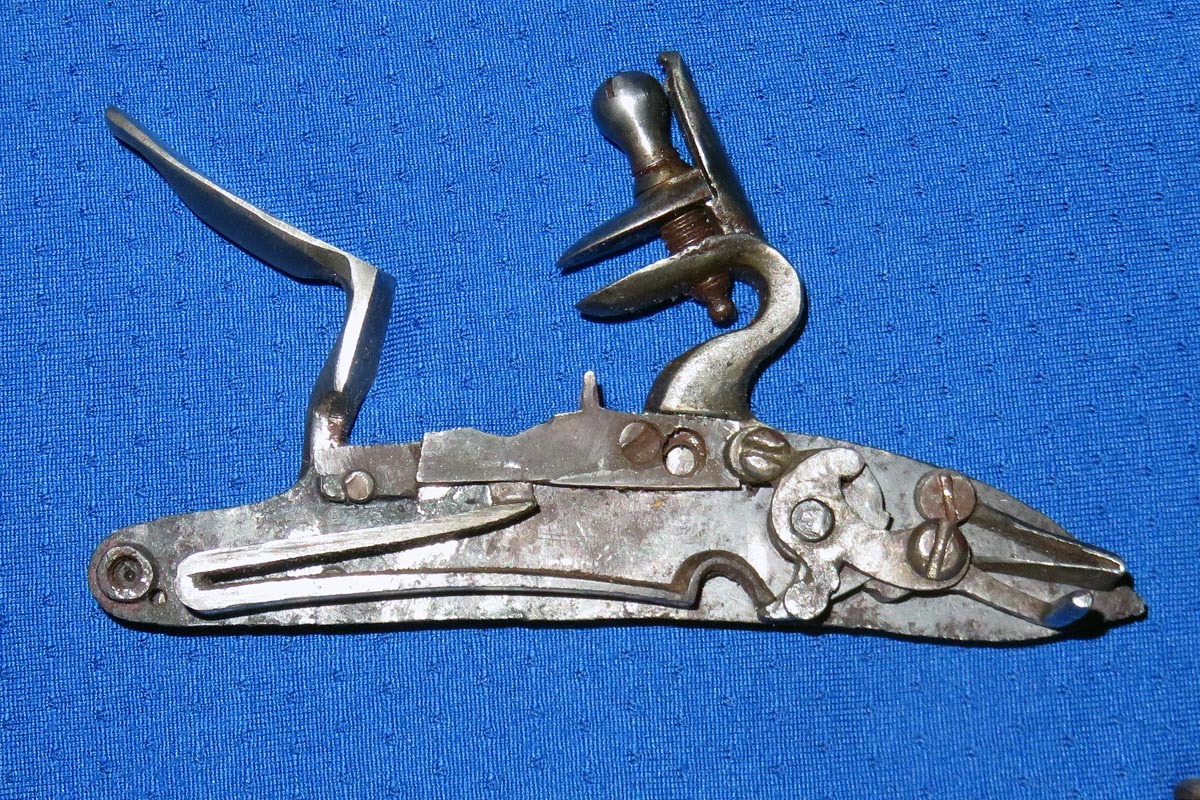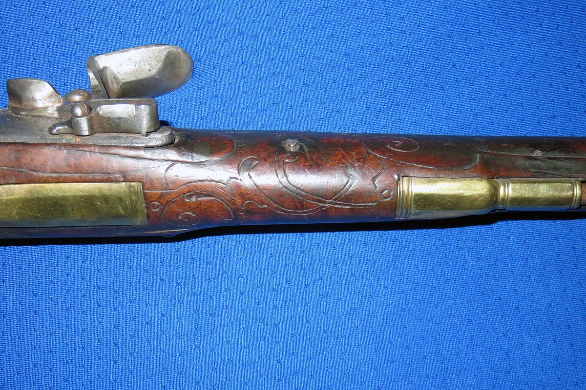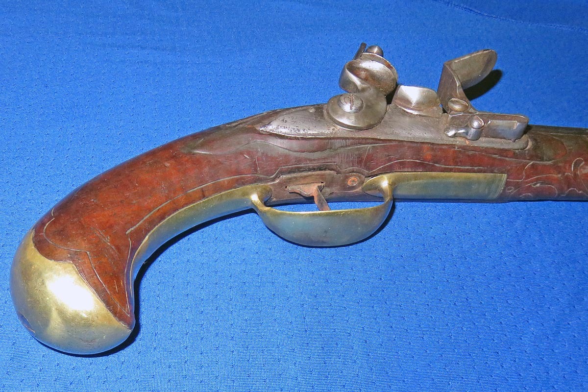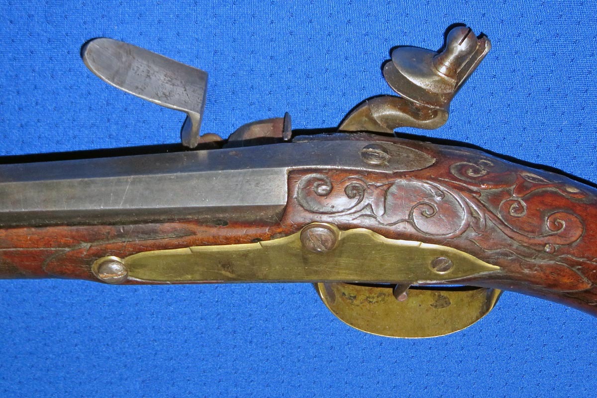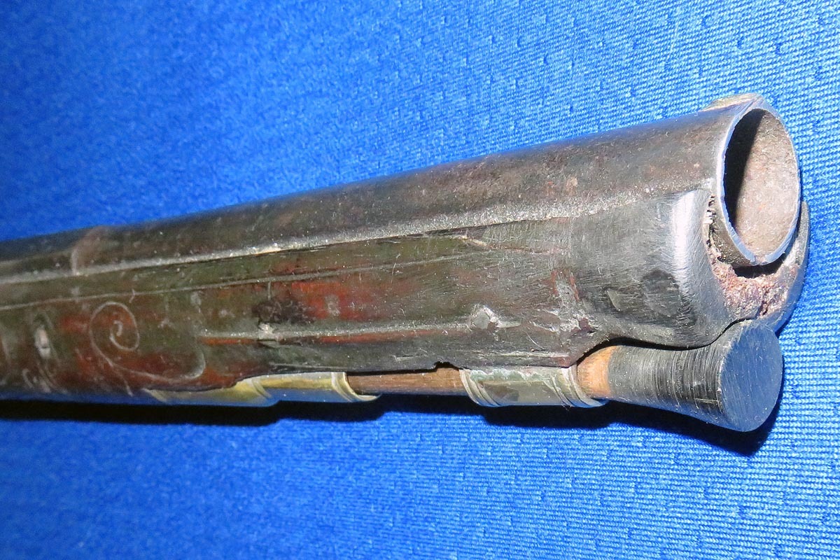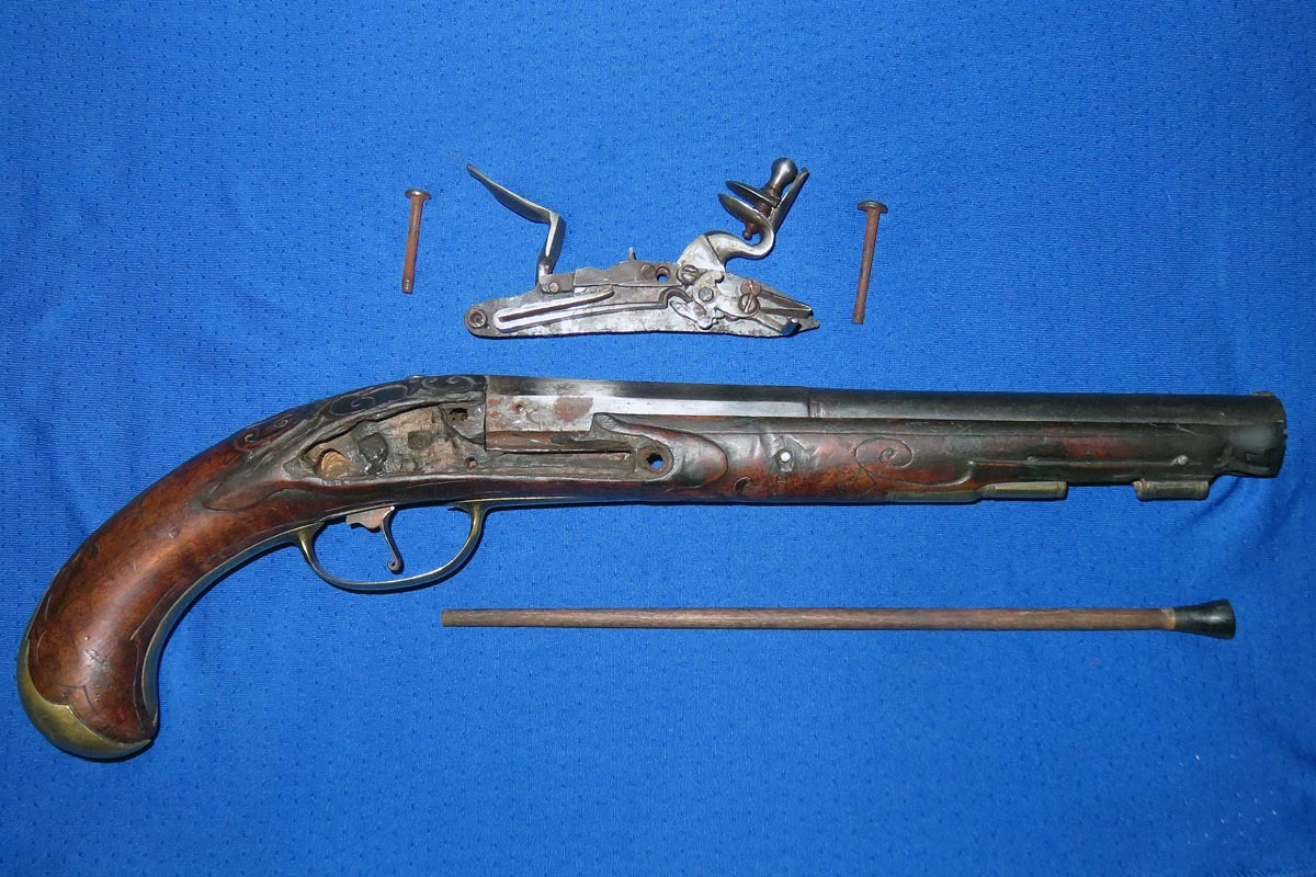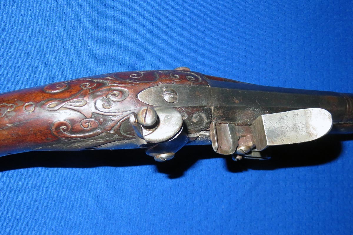 Originale Steinschlosspistole mit hinten achtkantiken nach vorne glatten Rundlauf im Kaliber 14,5 mm, Messingbeschläge, floral verschnittenen Nussbaumschaft, Holzladestock mit Hornabschluss und voll funktionsfähigem Steinschloss.