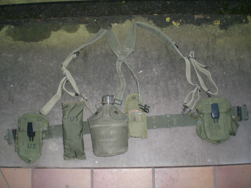 mit Y-Riemen und Taschen, diese teils mit Inhalt, wie Verbandspäckchen und Reinigungszeug für M16