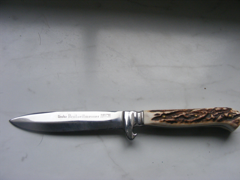 Gebe einen Jagdnicker ab. Auf der Klinge steht folgendes „Linder Brotzeitmesser Solingen Germany stainless INOX rostfrei“ (sofern ich es richtig entziffert habe). Hirschhorngriff. Gesamtlänge ca. 21,5 cm. Wurde nie benutzt, lag jedoch ewig in einer Schublade rum. Wurde noch nicht angeschliffen. Der Verkauf erfolgt unter Ausschluss jeglicher Sachmängelhaftung.
