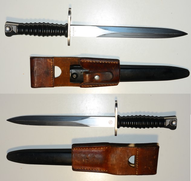 Schweizer Dolchbajonett für das SIG M 1957 Gewehr, mit Kunststoffscheide und Koppelschuh, sehr guter Zustand