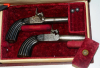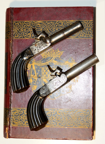Als Buch getarnter Pistolenkasten mit 2 Terzerolen, Frankreich um 1850, nach einem Vorblatt (Schokoladenwerbung) wird ein Pistolenkasten sichtbar. Darin zwei leicht unterschiedliche Terzerole, beide Waffen mit gezogenem Lauf, was bei Terzerolen nur selten vorhanden ist.