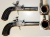 Im Bild oben: Lauflänge 5,6 cm, Gesamtlänge 15,6 cm, Zugkaliber 12,4 mm, 8 grobe Züge, auf dem Kasten Arabeskengravur, nummeriert mit "3", das Piston ist etwas zerdrückt, technisch und optisch guter Zustand