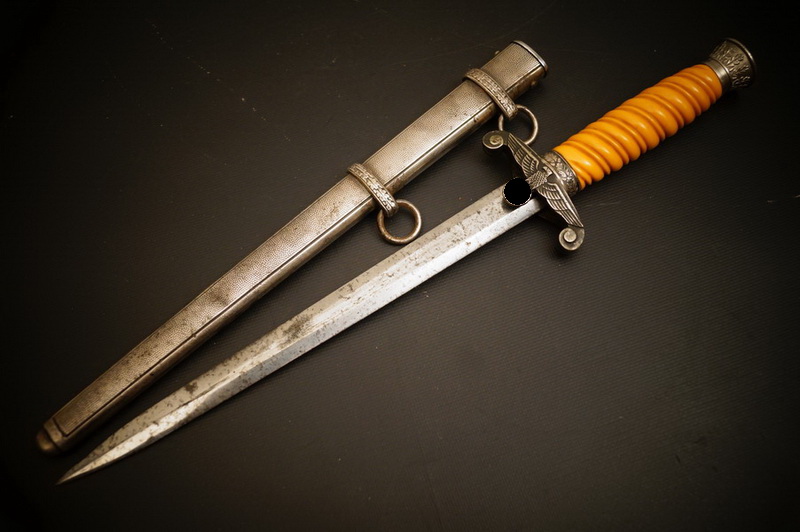 Fundzustand. Schön getragener Heeres Offz. Dolch mit heilem langem Trolon Griffstück und Namensgravur und Rgt. Im Knauf. Stahlklinge.