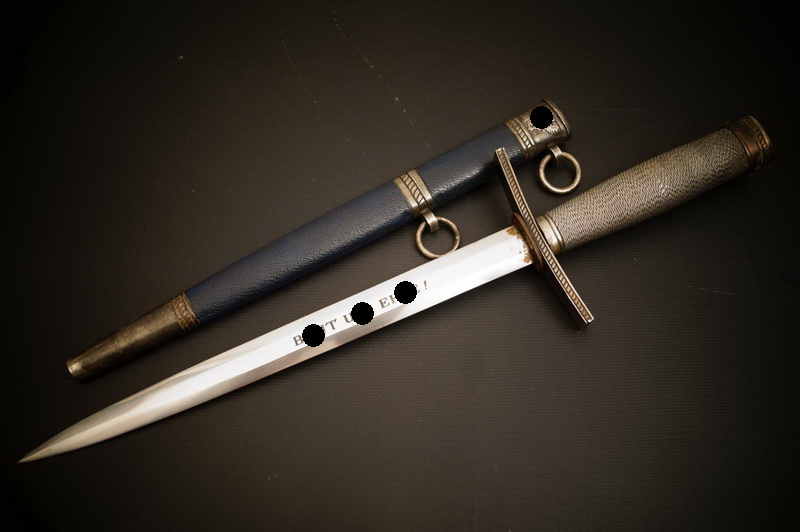 Fundzustand. Scheide mit geprägtem Reichsadler und feinem Saffianleder ohne Schäden. Klinge ist mit Hersteller und Motto. Parierstange und Kopfstück aus versilberter Bronze. Holzgriffstück mit Drahtwicklung. Kopfstück mit Aluniet.
