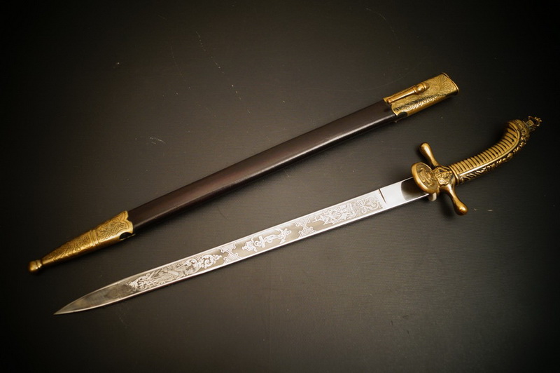 Fundzustand. Scheide aus Leder mit Luxusbeschlagteilen, diese Nummeriert und Nummerngleich. In der Scheide ist ein Holzblatt für guten Sitz der geschmiedeten Stahlklinge. Klinge mit sehr feiner Ätzung und Hersteller. Gefäß ist mehrteilig und mit Krone, alle Teile aus vergoldeter Bronze.