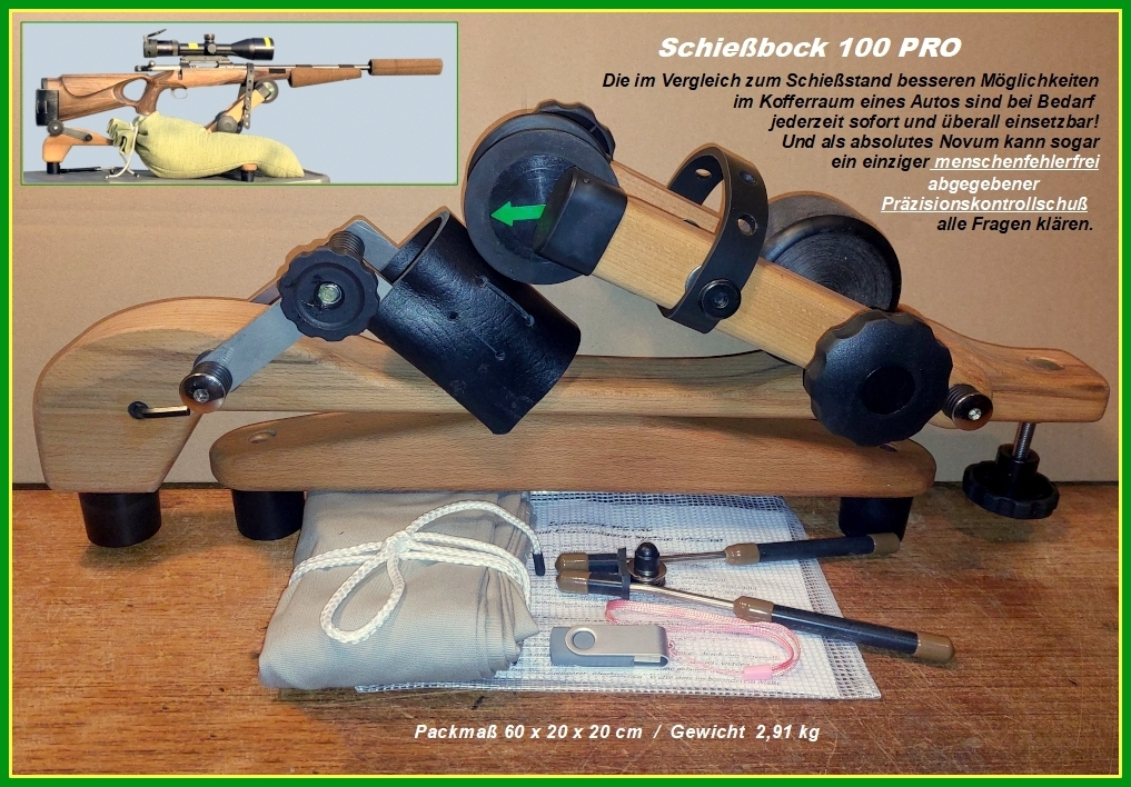 Erwähnenswert ist daher auch vorab, daß nach § 13 - Absatz 6 des Bundeswaffengesetzes das Ein- und Kontrollschiessen im Revier ohne eine Schußzahlbegrenzung erlaubt ist. Daraus ergibt sich also in Kombination mit dem Schießbock 100PRO eine vollkommene Unabhängigkeit von Schießständen und deren Öffnungszeiten.