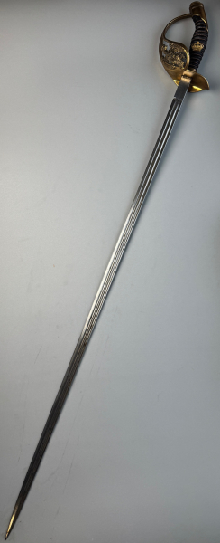 Deutsches Kaiserreich Infanterie Offiziersdegen ohne Scheide, vergoldetes Messinggefäss mit Preussenadler, Griffstück mit aufgeniteter Krone, ziemlich blanke Klinge mit Hersteller W.K.&C., Gesamt-Länge ca. 98cm., Klingen-Breite: ca. 19mm., leicht gebrauchtes Stück.