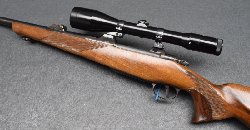 Montiert mit Zeiss Diavari-ZA 2,5-10x52 Abs.4, mittels EAW Schwenkmontage mit 30mm Ringen. Nußbaumschaft mit deutscher Backe & Riemenbügeln und Gummischaftkappe.