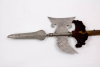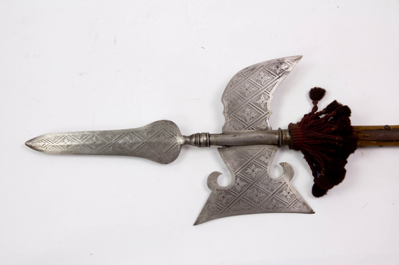 Hellebarde, England, um 1740, Zeremonie-Hellebarde, Blatt mit rhombischen Ätzungen und Ornamenten verziert, Waffennummer 12 auf Unterkante der Spitze in römischen Zahlen eingeschlagen, Originalschaft mit Seitenbespannung und verzierten Messingnägeln, Schaft im unteren Drittel schwarz gefasst, sehr selten in dieser Erhaltung, L: 228 cm.