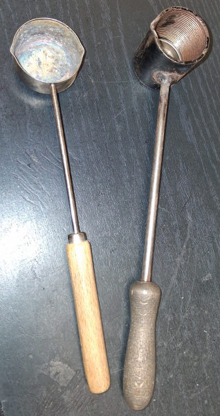 2 Schmelztiegel am Stiel zum Geschoss-Gießen aus Blei.