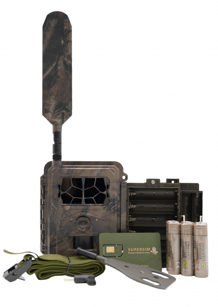 Seissiger Pro-Cam LTE, Antenne, 6 x 18650-Akkus, USB-C-Adapter, SIM-Karte, 32-GB-Speicherkarte, Wechselkassetten, Baumgurt und Baumstativ.