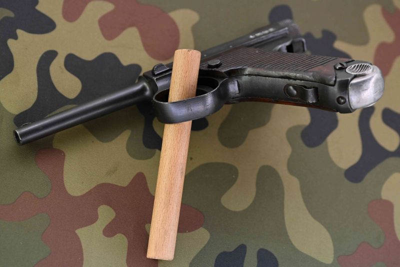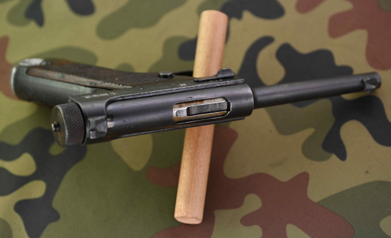 Dieses Exemplar ist eine späte Fertigung, da sie nicht mehr den anfangs runden, sondern einen ab September 1939 modifizierten, geweiteten, leicht verbeult ausschauenden Abzugbügel hat, der ein Bedienen mit Handschuh erlaubte.