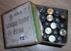 Messing, 19,5 mm lang und Ø 12 mm. Schachtel in altersbedingtem,Patronen