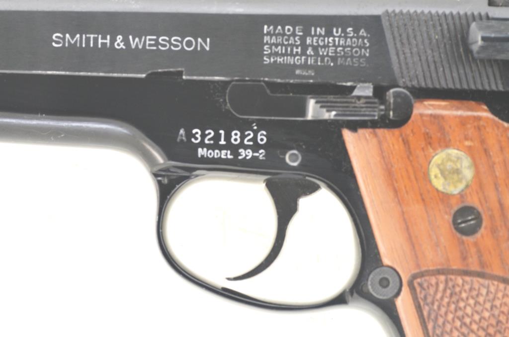 Markenlogo „S & W Trademark“ auf Rahmen rechts, deutscher Beschuss, „Pat´s Pending“, Hersteller „Made in USA. Marcas Registradas Smith & Wesson, Springfield, Mass.” Seriennummer "A321826" und Modellbezeichnung "Model 39-2" links auf dem Aluminiumgriffstück, oberhalb des Abzugbügels. Gültige deutsche Beschusszeichen aus dem Jahr 1977. Kaliberangabe "9 mm P" auf dem Patronenlager.
