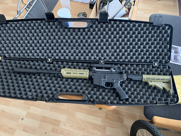 Sie bieten auf eine Begadi M4 mit vielen Tuningteilen. Es ist der abgebildete Koffer mit dabei, jede Menge Ersatz HopUp Gummis, Orginal Griffstücke, eine feste Schulterstütze usw.