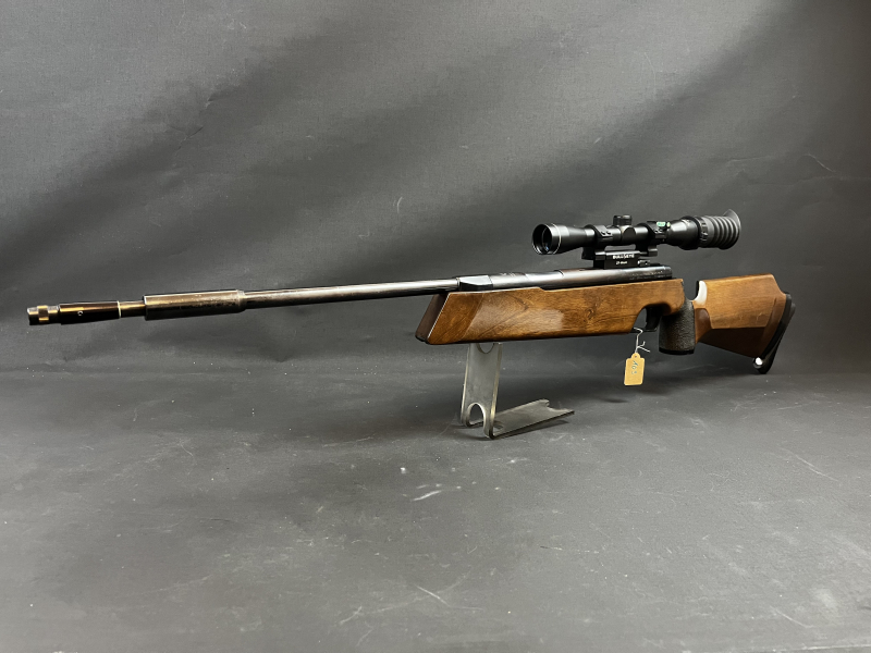Sie bieten hier auf ein Feinwerkbau Luftgewehr Mod. 300s im Cal. 4,5mm inklusive Schalldämpfer Adapter, Optik von Walther 4x32 und Rücklauf geführte Montage von Bulls Eye.
