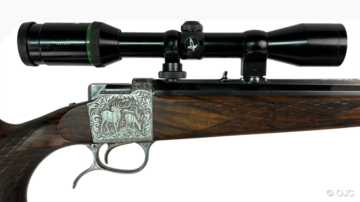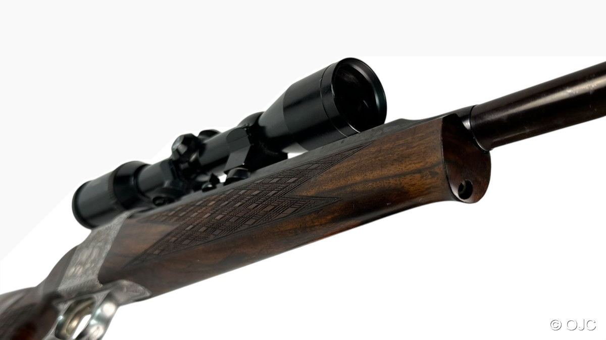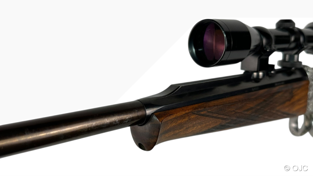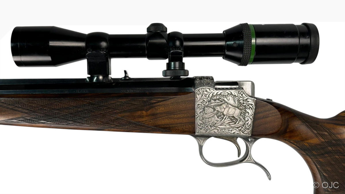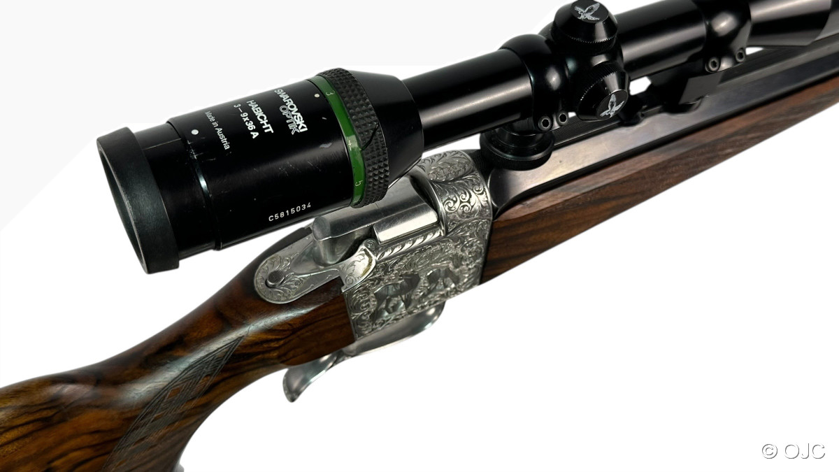 Diese seltene Blockbüchse aus dem Hause Blaser verfügt über einen Systemkasten mit edlen Gravuren und ein ansprechendes, dunkles Schaftholz. Ferner ist ein Schaftmagazin für drei Patronen vorhanden! Über eine Schwenkmontage ist ein Swarovski Habicht 3-9x36A mit Absehen 4 verbaut.