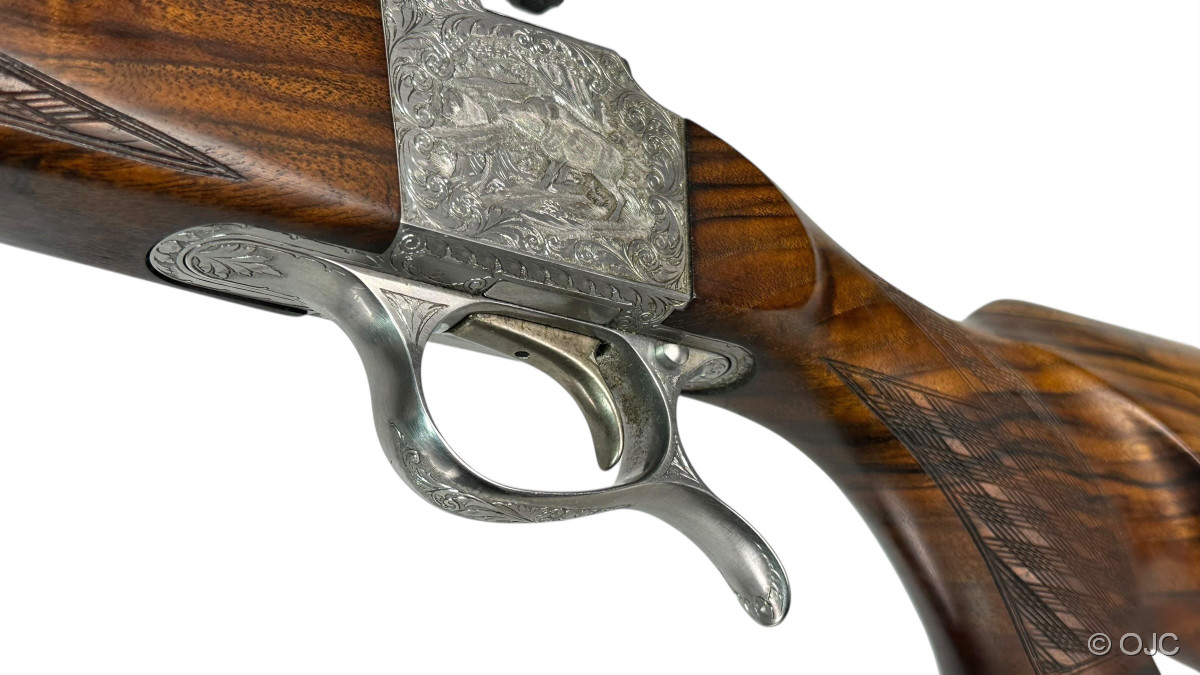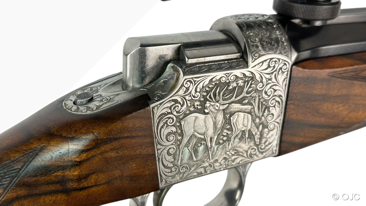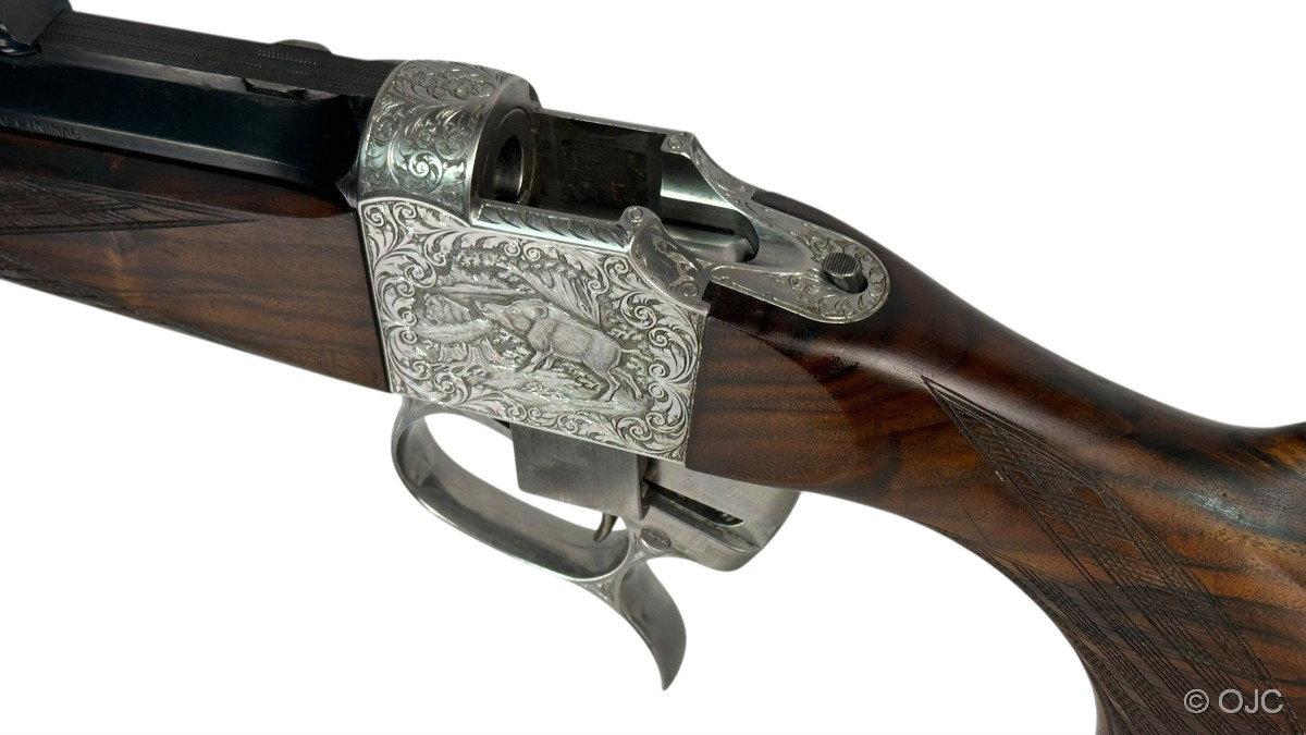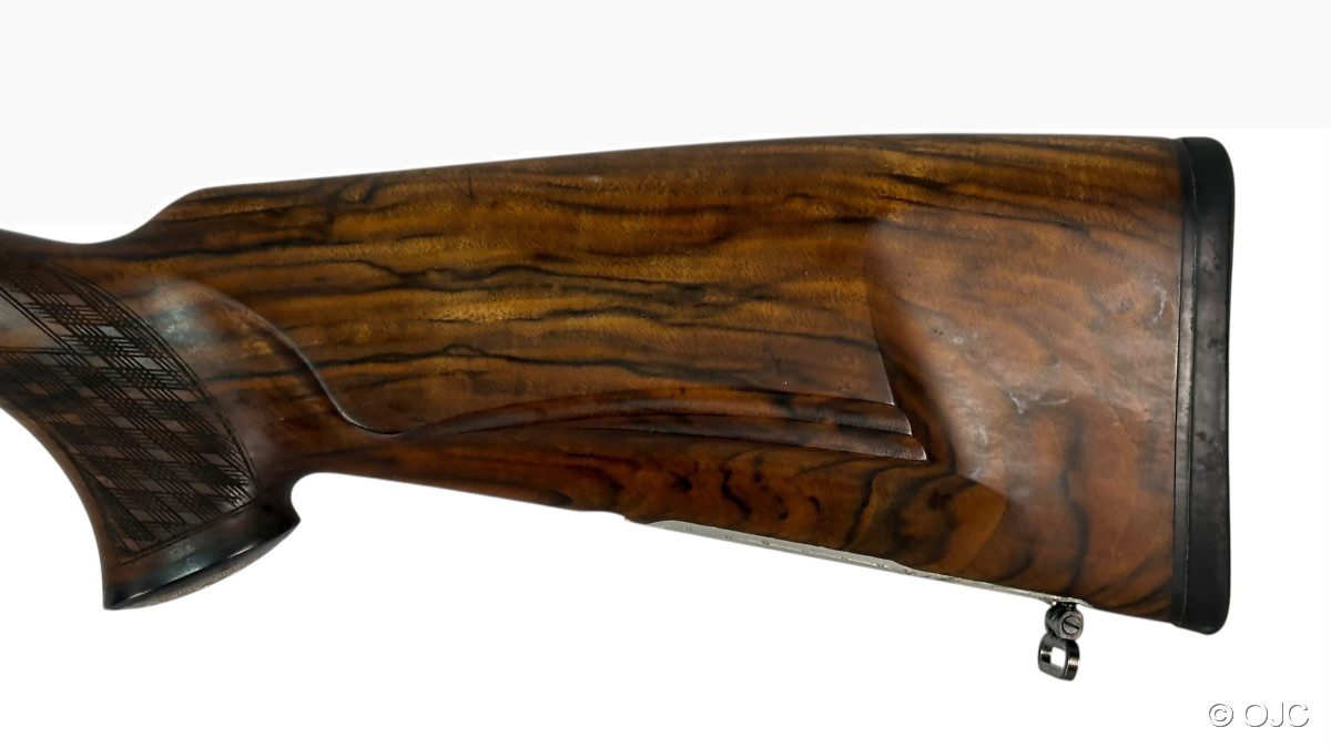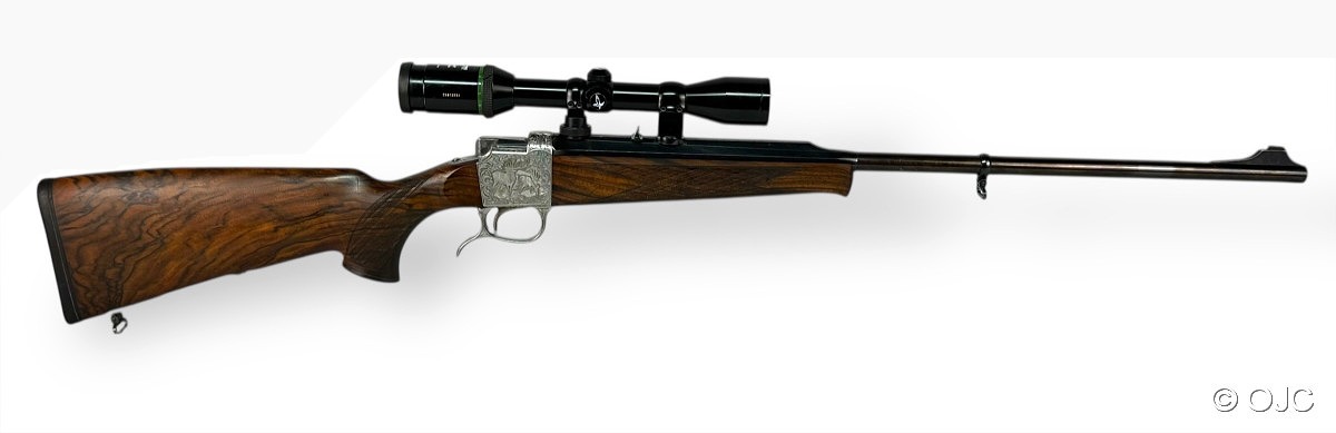 Diese seltene Blockbüchse aus dem Hause Blaser verfügt über einen Systemkasten mit edlen Gravuren und ein ansprechendes, dunkles Schaftholz. Ferner ist ein Schaftmagazin für drei Patronen vorhanden! Über eine Schwenkmontage ist ein Swarovski Habicht 3-9x36A mit Absehen 4 verbaut.