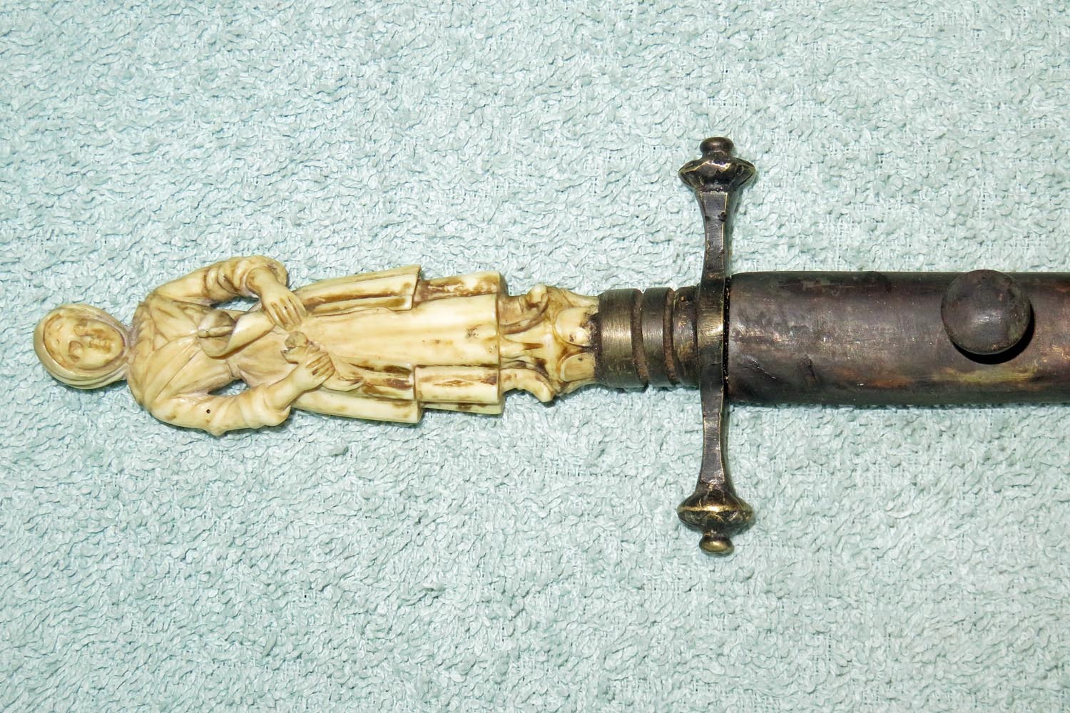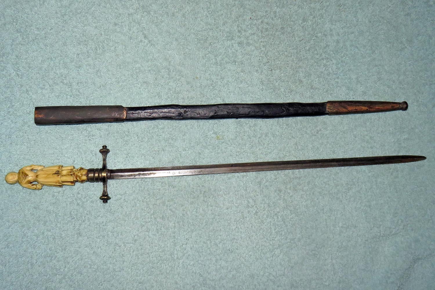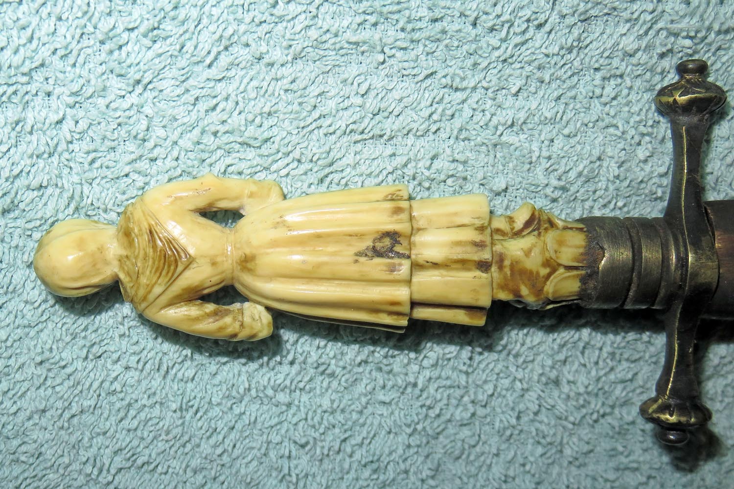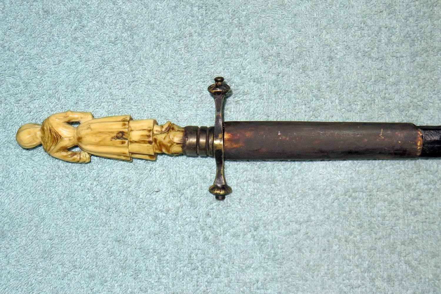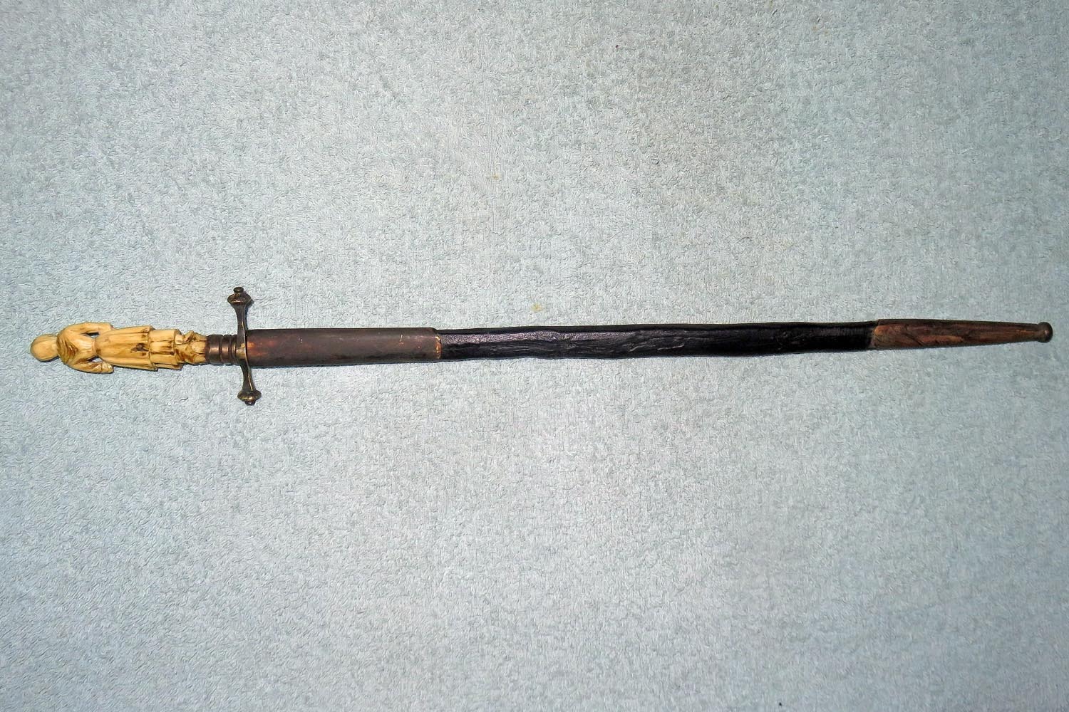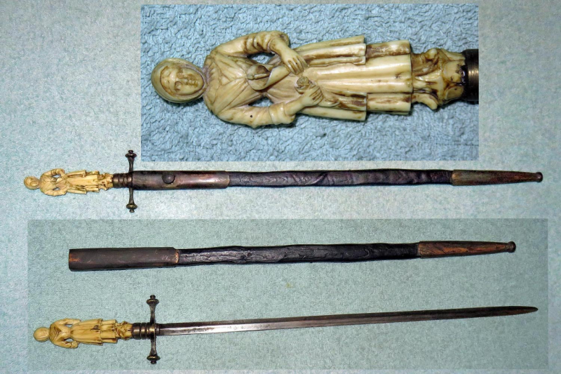 Altes Stilett mit fein ausgearbeiteter und geschnittener Frauenfigur in Bein als Griff, Parierstange in Messing, schwarzer Lederscheide mit Messingbeschlägen und zweischneidiger Vierkantklinge.