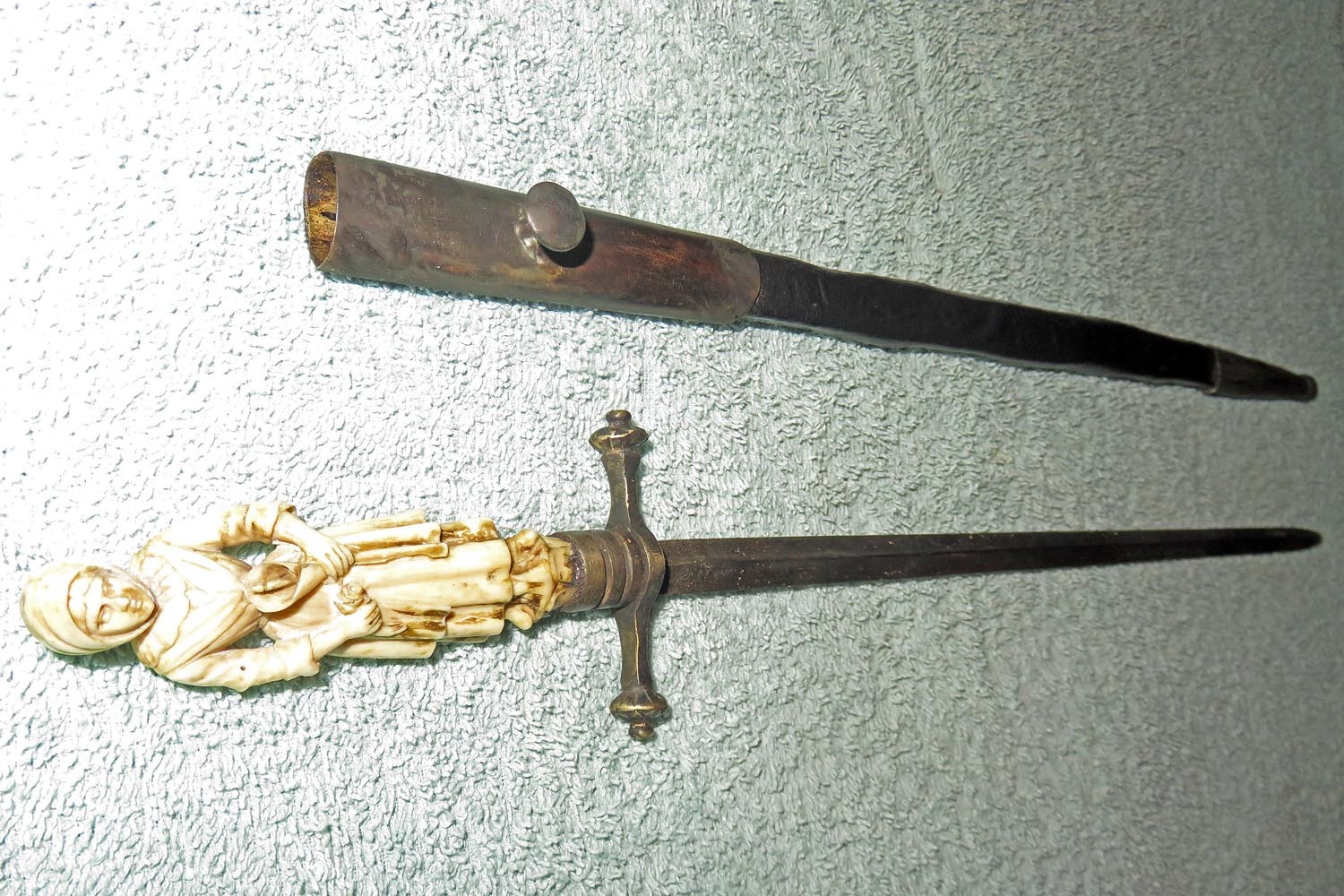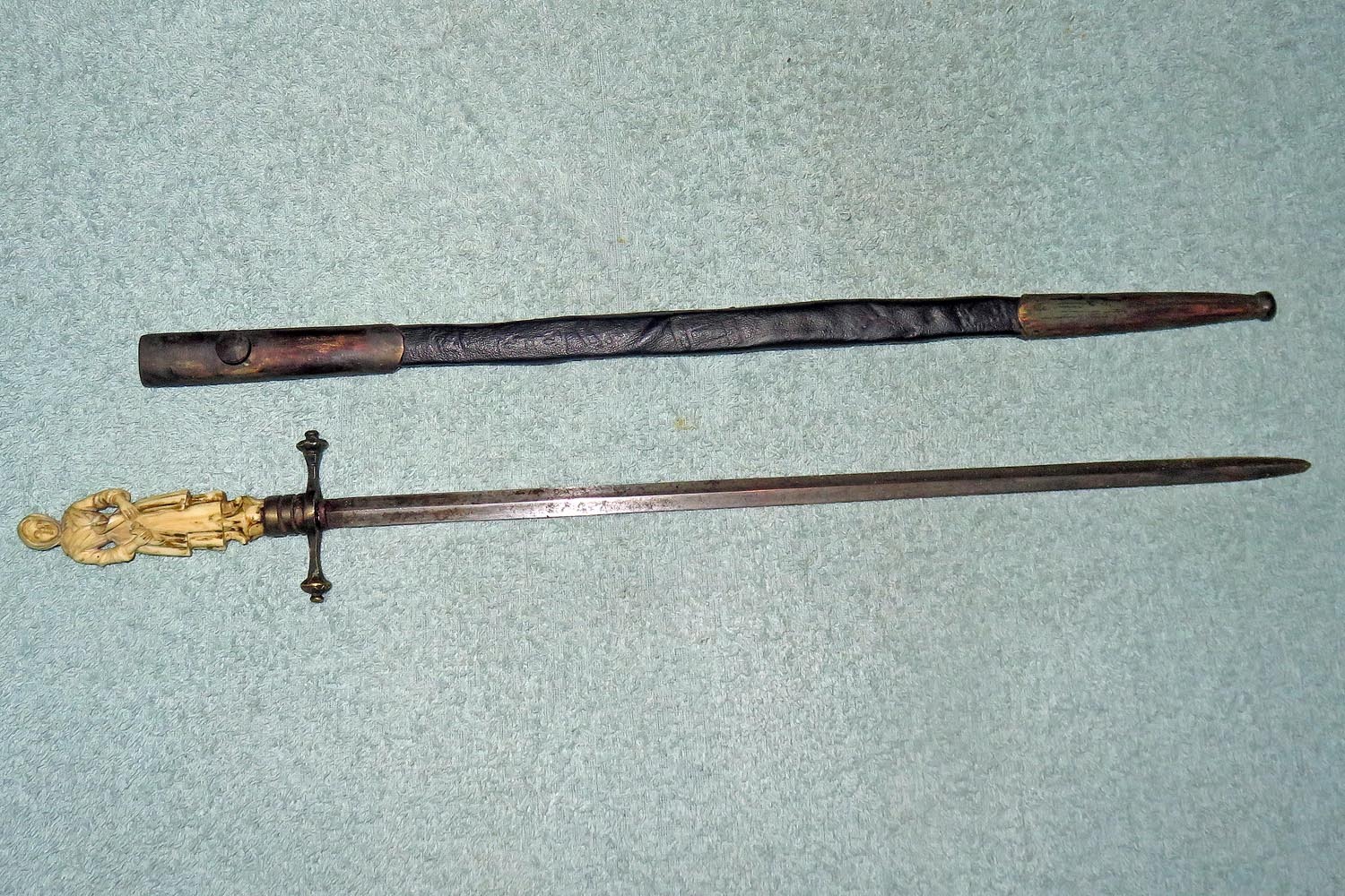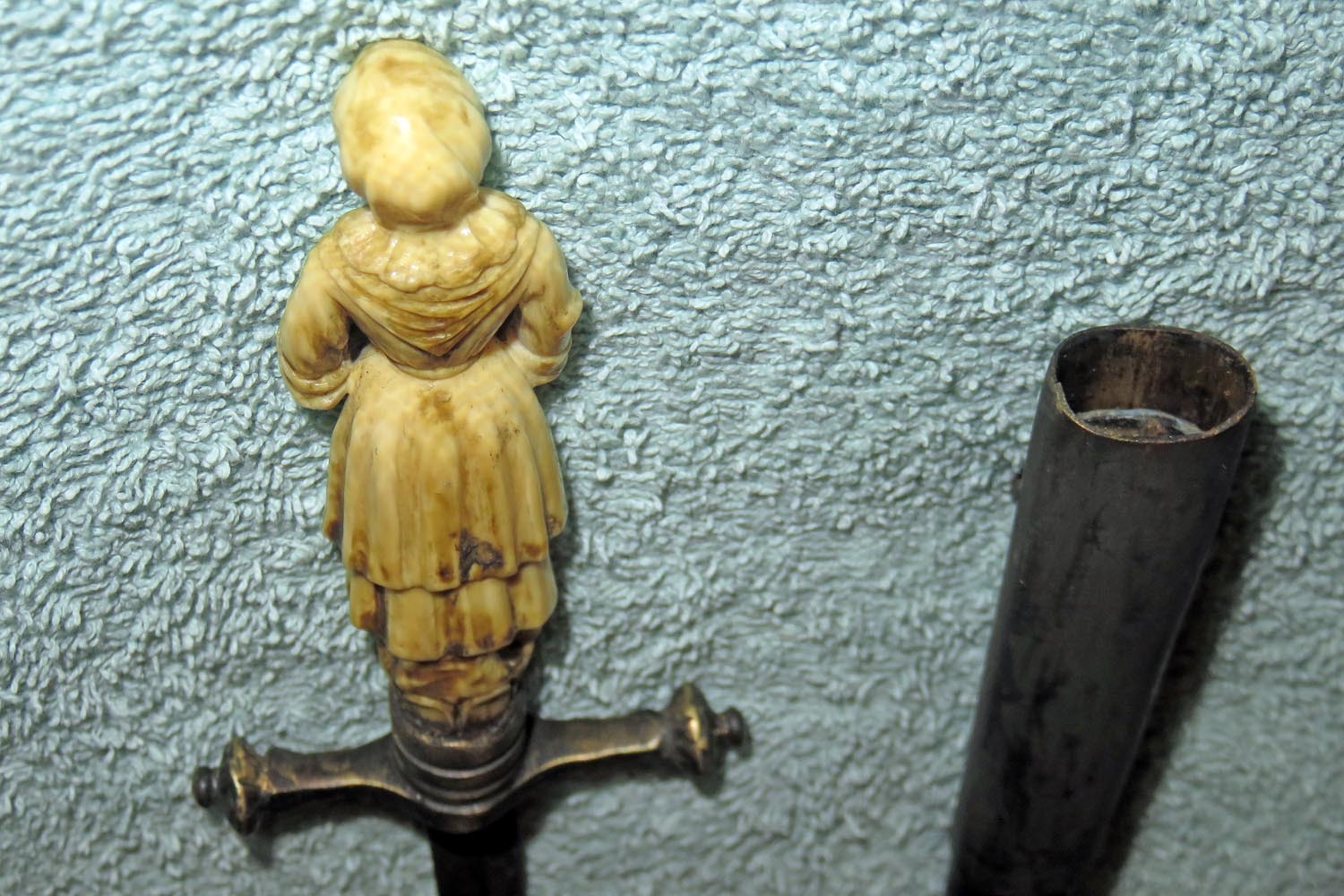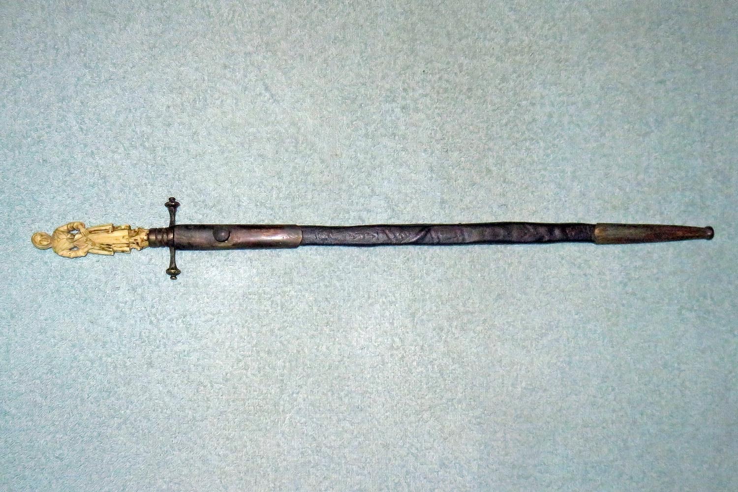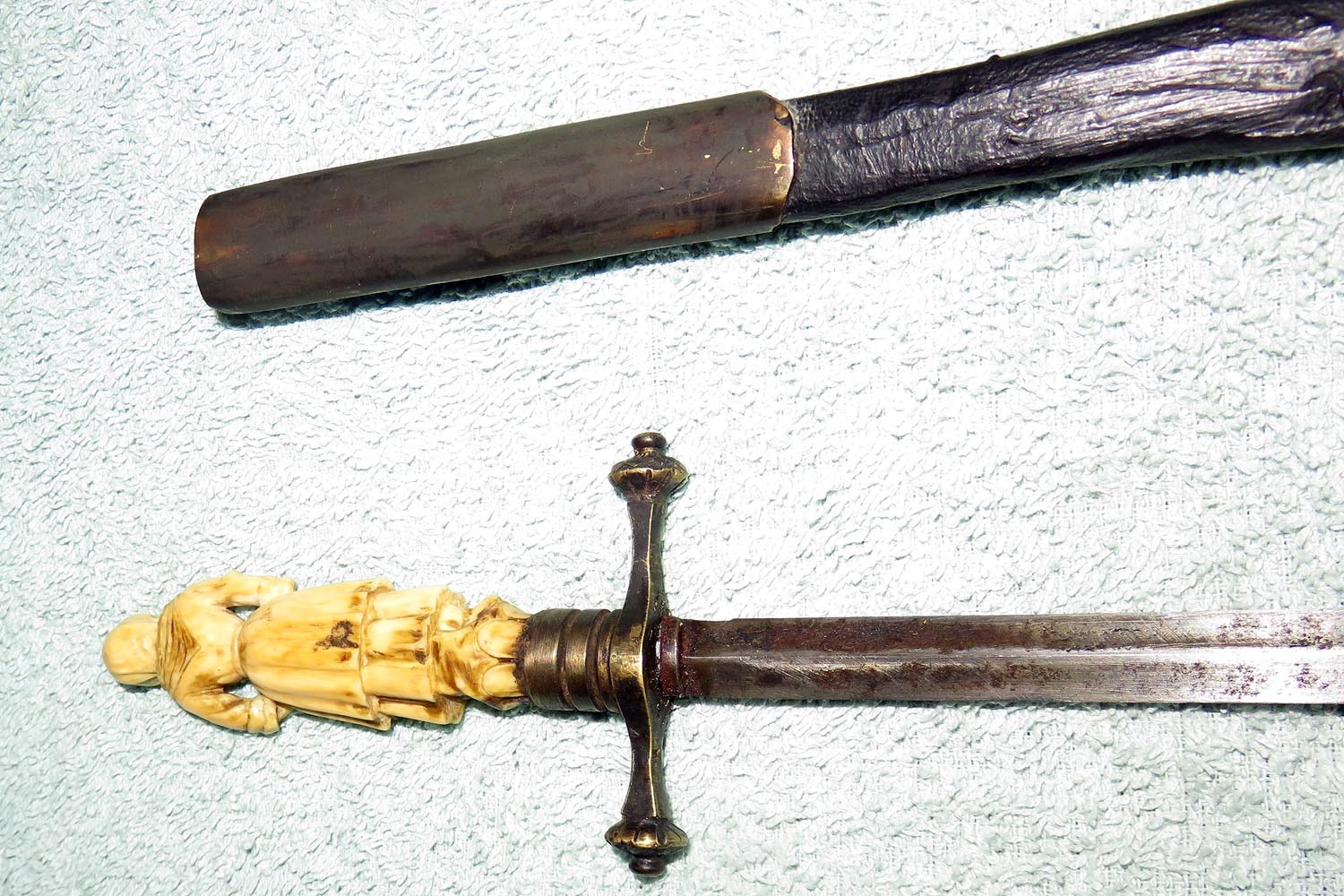 Altes Stilett mit fein ausgearbeiteter und geschnittener Frauenfigur in Bein als Griff, Parierstange in Messing, schwarzer Lederscheide mit Messingbeschlägen und zweischneidiger Vierkantklinge.