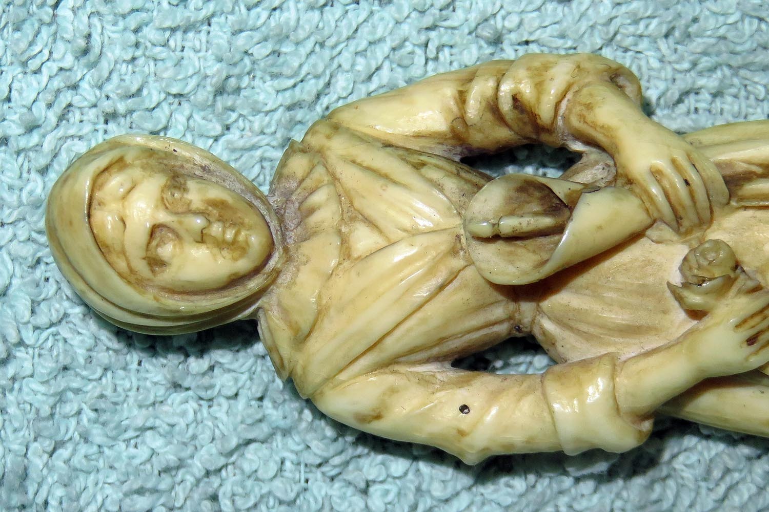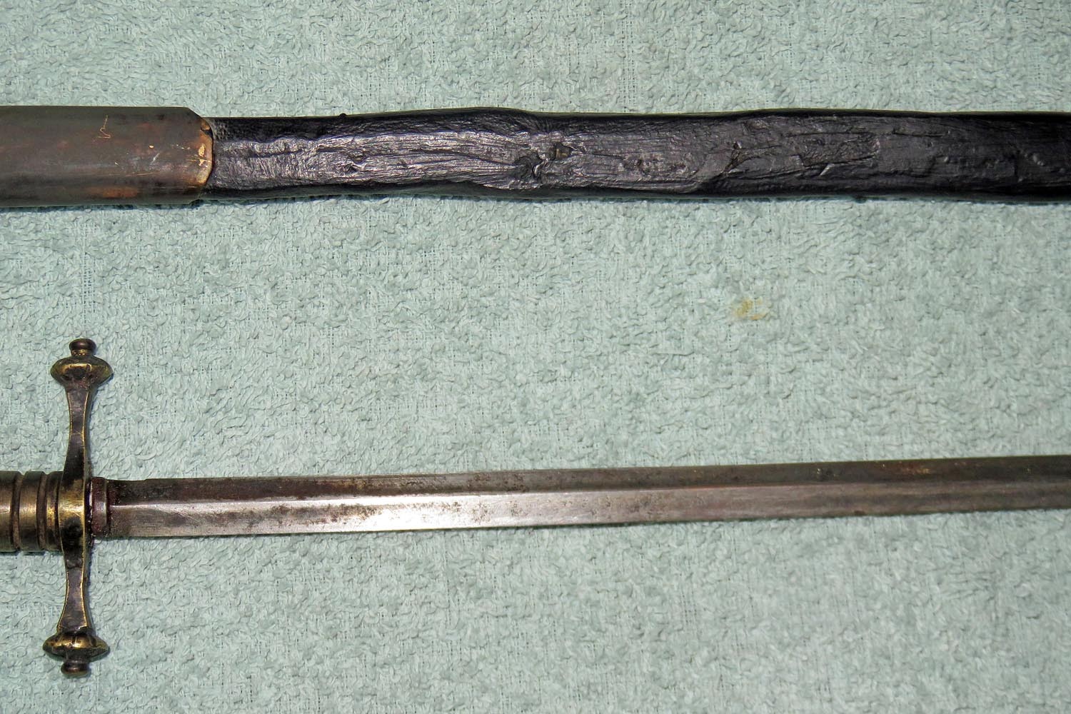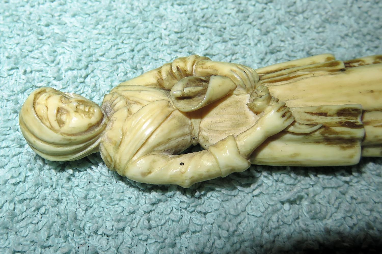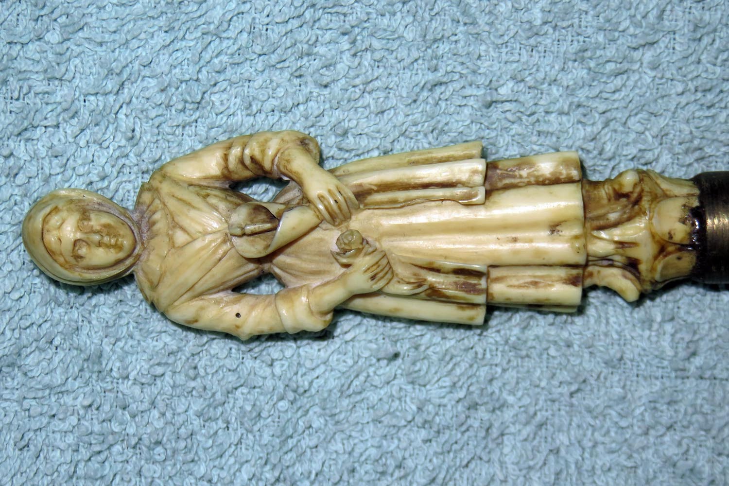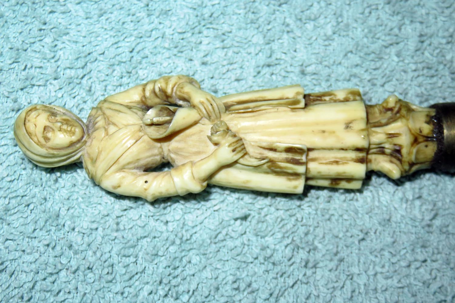 Altes Stilett mit fein ausgearbeiteter und geschnittener Frauenfigur in Bein als Griff, Parierstange in Messing, schwarzer Lederscheide mit Messingbeschlägen und zweischneidiger Vierkantklinge.