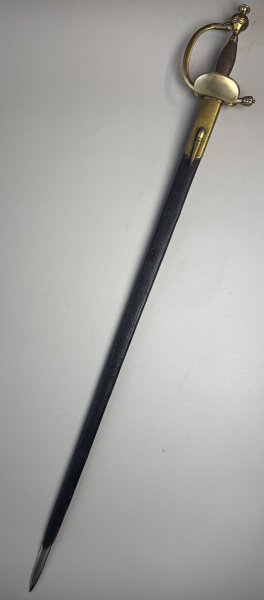 Preussen Degen für Beamte und beschädigter Lederscheide. Beamtendegen mit vergoldetem Gefäß und Drahtwicklung im Griffstück, blanke, gekehlte Klinge und Hersteller, Gesamtlänge ca. 90,5cm., gebrauchter Zustand.