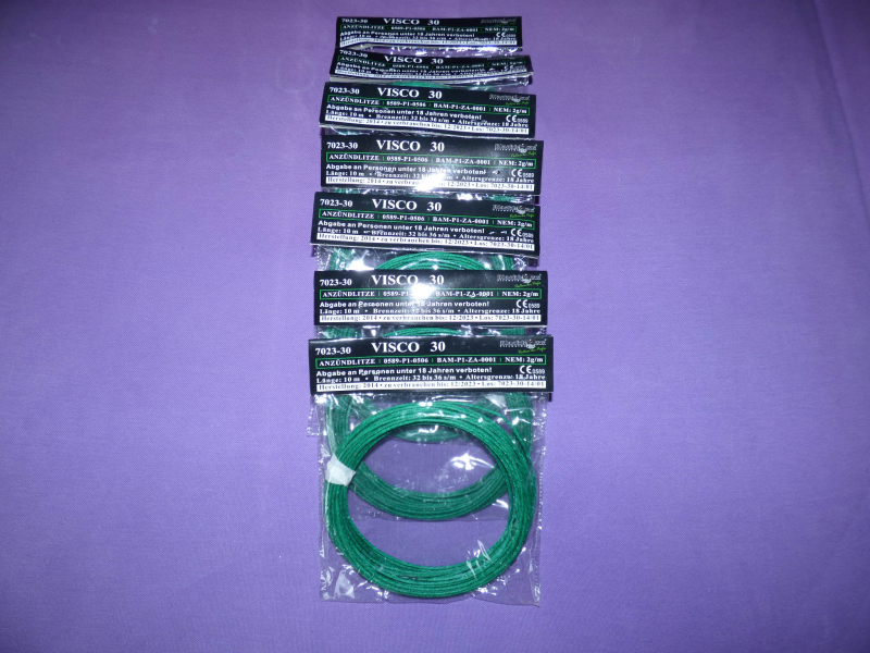 Angeboten wird die Zündschnur/Anzündlitze auf dem Foto. 10 m VISCO 30, Brenndauer: 32-36 sec/Meter. Originalverpackt. Herstellungsjahr: 2014 zu verbrauchen bis 12/2023. Die Zündschnur ist originalverpackt und wurde in einer luftdichten Alubox kühl und trocken gelagert. Obwohl das MHD abgelaufen ist, brennt die Zündschnur noch einwandfrei (letzten Silvester getestet). Der Preis bezieht sich auf eine Packung zu 10 m. Versand als Hermes Päckchen zum Selbstkostenpreis von 4,89 EUR. Bis zu 2 Packungen können für 4,89 EUR verschickt werden. Bei mehr als 2 Packungen dann 5,49 EUR (Hermes) oder 6,19 EUR (DHL-Paket). Habe noch weitere Anzündlitze von WANO im Angebot. Es kann auch "gemischt" bestellt werden (nur einmal Versandkosten entsprechend nach Menge). Frei ab 18 Jahren. Ein Altersnachweis ist erforderlich (außer ID Mitglieder).