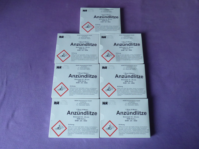 Angeboten wird die Zündschnur/Anzündlitze auf dem Foto. 8 m WANO Anzündlitze, Brenndauer: 18-28 sec/Meter. Herstellungsjahr: 11/2014. Die Zündschnur ist originalverpackt und wurde in einer luftdichten Alubox kühl und trocken gelagert. Die Zündschnur brennt noch einwandfrei (letzten Silvester getestet). Der Preis bezieht sich auf eine Packung zu 8 m.