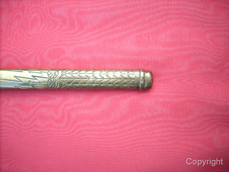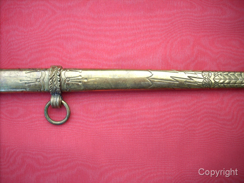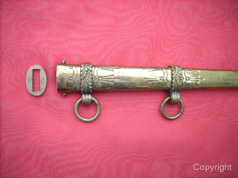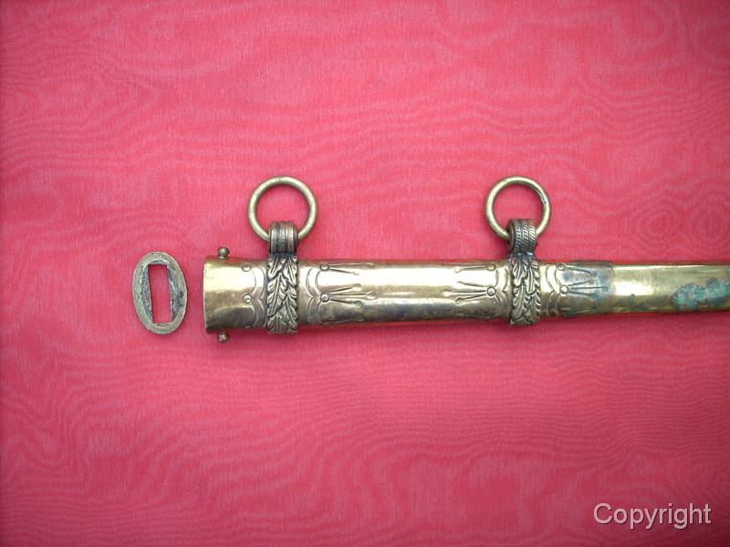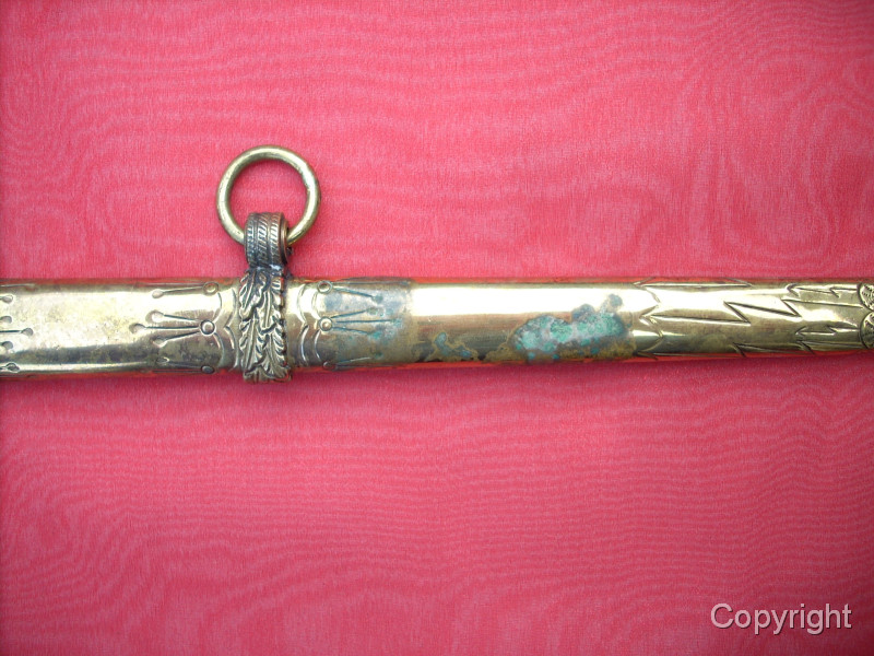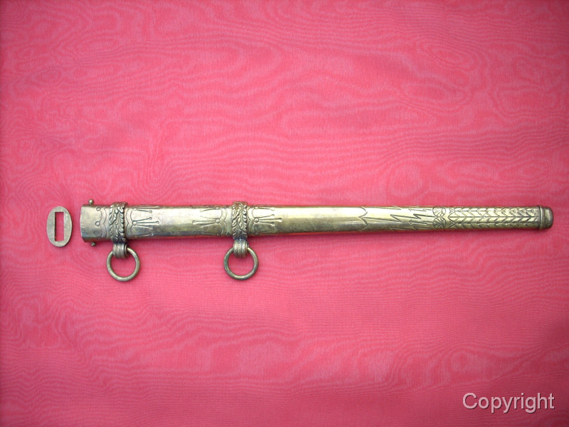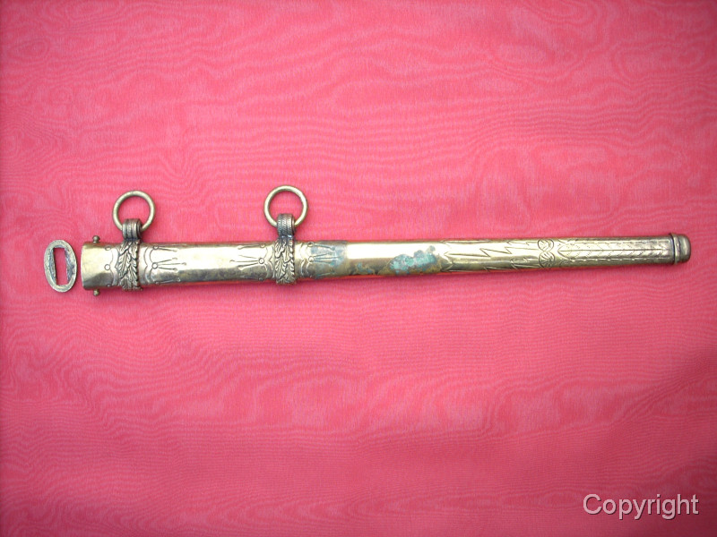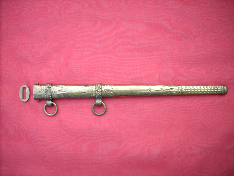Scheide zum Kriegsmarinedolch KOD, evtl. von Eickhorn (Fertigung läßt darauf schließen, allerdings nicht garantiert). Beim Mundblech fehlt das Innenstück, die Aussenplatte ist vorhanden (siehe Fotos). Auch werden 2 originale Befestigunsschrauben beigegeben – schon eingeschraubt. Das Stück hat k e i n e Beulen und noch eine gute Vergoldung. Die Scheidenringe sind separat aufgelötet. Lagerspuren. Solche Ersatzteile werden sehr selten angeboten - Gelegenheit. Ungereinigter Zustand siehe Fotos, die Bestandteil der Beschreibung sind. Keine Garantie und keine Rücknahme.