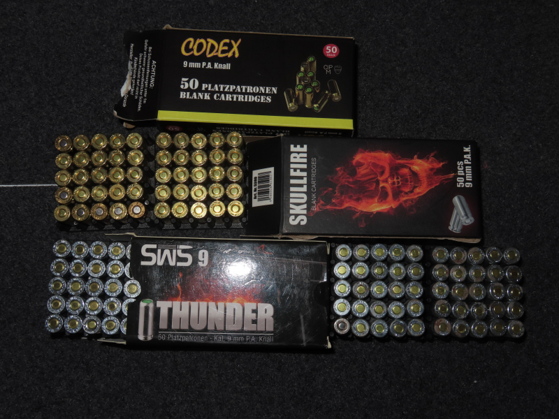Biete hier 150 Platzpatronen im Kal. 9mm PAK für Pistolen.Es sind 50 Patronen Codex -50 Patr.Skullfire -50 Patr. Thunder. Verpackung teils beschädigt. Verschickt mit DHL als Maxibrief. Da Privatverkauf, keine Garantie oder Gewährleistung