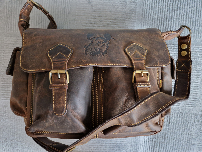 in dunkelbraun. Die Tasche hat verschiedene Außentaschen und Innentaschen. Auf dem Taschenumschlag ist ein Wildschwein eingestanzt. Wegen Aufgabe des Schießsports zu verkaufen.