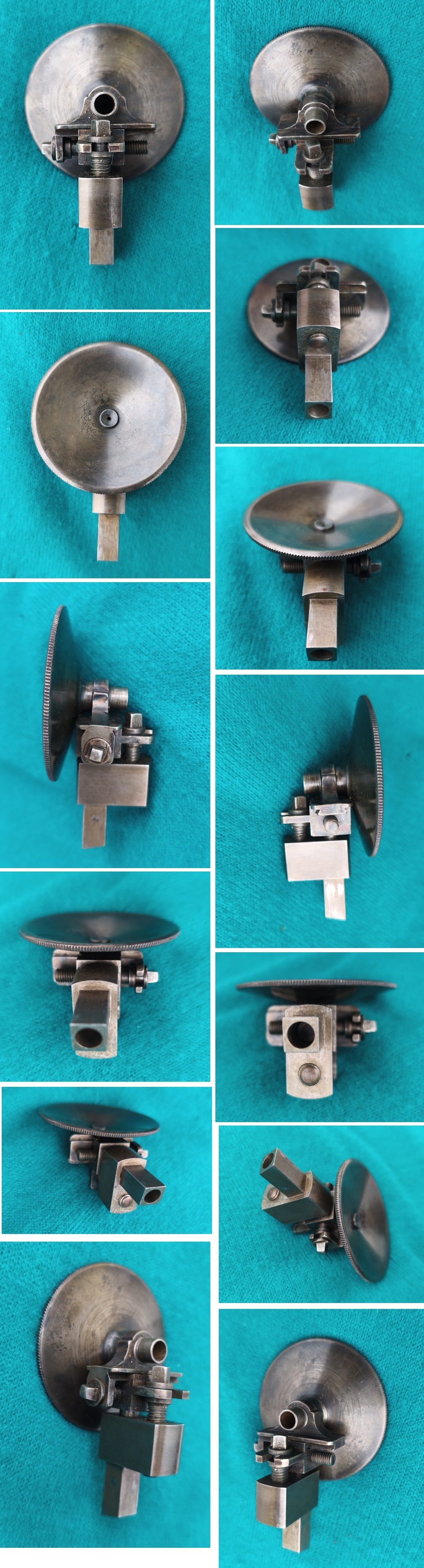 Großer Teller (55,5mm) mit Rahmen und Fuß, gebläut, Höhen- und Seiten verstellbar. Vierkant circa 8x8mm. Aktuell eingestellte Höhe Diopterloch zur Unterkante Rahmen 34,4mm.
