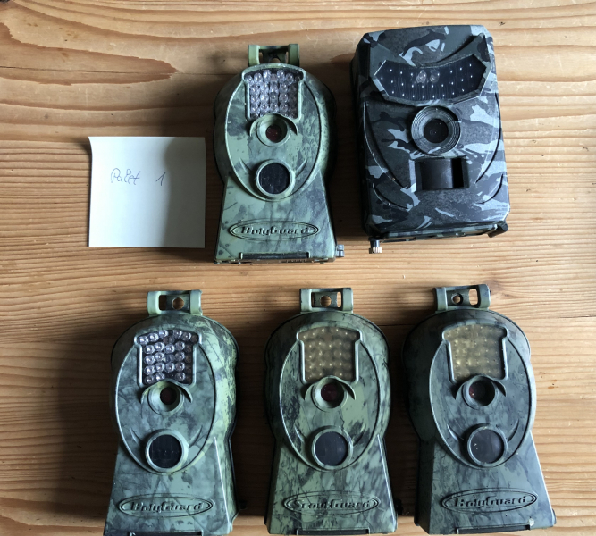 Ich biete hier 5 Wildkameras an, die nicht mehr funktionieren. Ich habe die Kameras als Attrappen verwendet.
