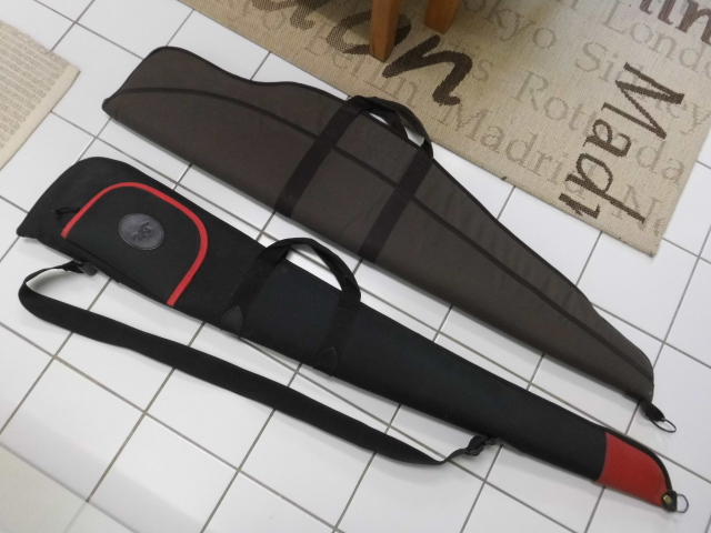Zwei Gewehr - Futterale mit Trageriemen . Das schmalere ist von Browning mit einer Vortasche und einem Choke-Schlüssel Kal. 12 .