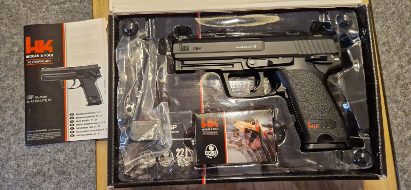 Heckler & Koch USP 4,5 mm BB Co2-Pistole (Non Blow Back). Waffe nur zu Testzwecken geschossen, Verpackung hat Lagerungsspuren, funktioniert einwandfrei. Privatverkauf ohne Rücknahme und Gewährleistung, DHL oder Selbstabholung.