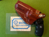 Es handelt sich hier um ein reines Innenbundholster im traditionellen Format, d.h., mit der doppelten Druckknopfklappe die sich auf den Gürtel von unten nach oben schließen lässt. Auch als Gürtelholster Linkshand verwendbar, besteht aus dem üblichen hochqualitativen, ausgewählten Braunleder von Ross. Offen am Lauf, hat einen stahlverstäkten Druckknopfverschluss, sichtbar auf allen Bilder der Vorderseite (die eigentlich beim Tragen die innere ist). Hier die Rückseite mit einem passenden Gürtel