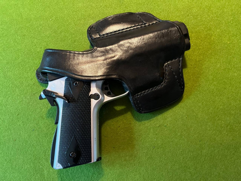 Aus schwarzem, formstabilen Leder, rechtshand und dank der Öffnung am Lauf auch passend für ähnliche Pistolen mit einem längeren Lauf. Die bedeckte Gürtelschlaufen, hier sichtbar auf dem üblichen Bild der Rückseite