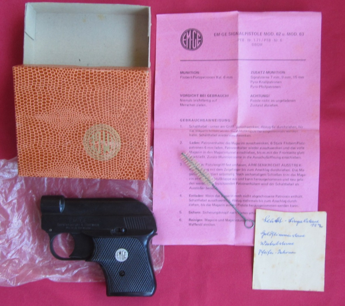 Biete hier diese Signalpistole der Marke EM GE – mit der PTB Punzung 6 – zum Kauf an. Die Pistole befindet sich in der orginal Verpackung, samt Gebrauchsanweisung und Reinigungsbürste, ein schönes, komplettes Set. Die Signalpistole ist in einem sehr gepflegten Zustand, Brünierung vollständig erhalten, sauber gearbeitet. Alle mechanischen Teile gut beweglich, der Druckpunkt liegt im hinteren Bereich und ist gut spürbar. Die Pistole ist auf der rechten Seite gepunzt mit „Mod.62, Cal. 6mm und dem Kreis runden PTB Zeichen 6“. Auf der linken Seite des Schlittens ist das Herstellerkürzel „EM-GE“, sowie der Name „Gersternberger u. Eberwein“ und „Made in Germany“ gemarkt. Einzelheiten siehe Bilder, sie sind wesentlicher Bestandteil der Beschreibung. Privatverkauf.