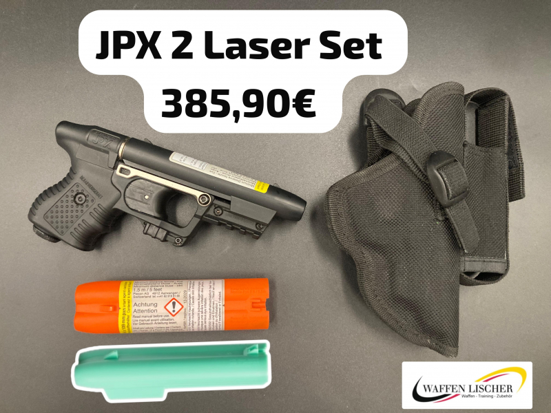 Bestandteil der Auktion ist der JPX2 Laser mit Box und zwei Pfeffer Kartuschen eine in schwarz eine in signalorange sowie einem Holster und einer blauen Trainingskartusche