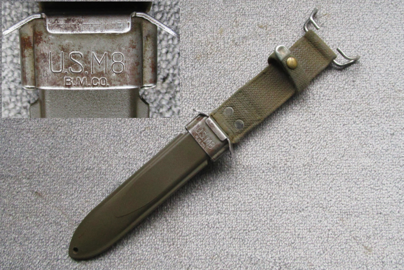 Biete hier diese originale Bajonett-Scheide für ein US-Carbine 30M1 Bajonett an, original 2. Weltkrieg-Fertigung, Hersteller B.M.CO. ( Bailey Manufacturing Company ), Gesamtlänge 32cm, Länge der Scheide 18,7cm, sehr guter Originalzustand, ohne Mängel oder Beschädigungen, Fragen hierzu gerne per email, allen Bietern viel Erfolg !