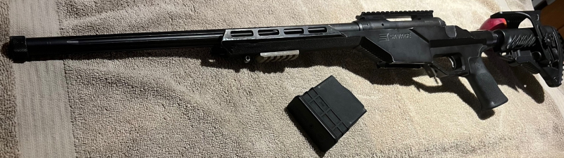 Ordentlich genutzte Savage zu verkaufen, die Waffe hat Gebrauchsspuren und mind. 6000 Schuss durch. Ein Trefferbild bei 5 Schuss auf 100m von 10 cm ist noch möglich. Waffe wird mit 10 Schuss Magazin verkauft. Schaft ist in der Länge variabel. Lauflänge beträgt 20 Zoll.