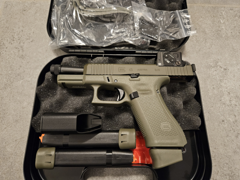 Zum Verkauf kommt eine halbautomatische Pistole des Herstellers Glock. Es handelt sich um das Modell 45 Gen 5 mit A-CUT in der Hunter Combo Ausführung in oliv-grün im Kaliber 9 mm Luger inklusive Aimpoint COA Minileuchtpunktvisier mit 3,5 MOA wie auf den Fotos dargestellt. Die Waffe eignet sich Optimal für Jäger als Fangschusswaffe. Der Zustand der Waffe ist neu. Die Lauflänge beträgt 117 mm. Der Verschlussfanghebel ist beidseitig bedienbar, die Waffe verfügt über einen Gewindelauf mit den Spezifikationen M13,5x1 links sowie Front Serrations und einer breiteren Endplatte als Durchladehilfen. Der Magazintrichter ist leicht ausgestellt, um ein besseres Laden zu ermöglichen. Das Abzugsgewicht beträgt ca. 2.600 Gramm. Die Magazinkapazität liegt bei 19 Patronen. Zum Lieferumfang gehören weiterhin zwei Magazine, ein Transportkoffer, ein kleines Putz-Set sowie zwei Back Straps zur Anpassung der Rahmengröße und ein Handbuch. Bei Fragen gern eine kurze E-Mail. Viel Spaß bei, Bieten.