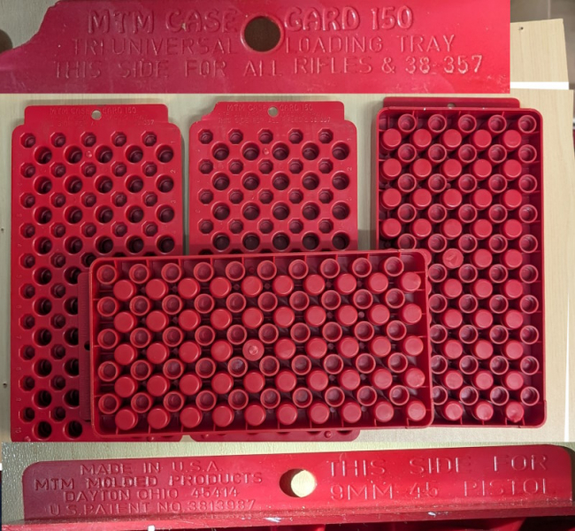 Verkaufe im Auftrag 4 Ladebretter von MTM. Schwere Ausführung aus Kunststoff. Eine Seite für gängige Langwaffenkaliber, die andere für Kurzwaffenkaliber. Bei einem Brett ist die Lasche angebrochen, sonst keine weiteren Mängel.