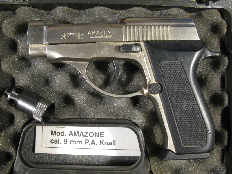 Schreckschusspistole 9mm "Amazone" in silber, mit originalem Koffer, Abschussbecher, Betriebsanleitung (darin auch Zerlegungsanleitung und Explosionszeichnung / Ersatzteilliste mit Ersatzteilnummern). Wenig gebraucht, alles funktionsfähig. Verkauf von privat ohne Gewährleistung / Garantie / Rückgabe. Käufer trägt an Versandkosten nur das versicherte Paketporto. Versand erst nach Altersnachweis möglich!