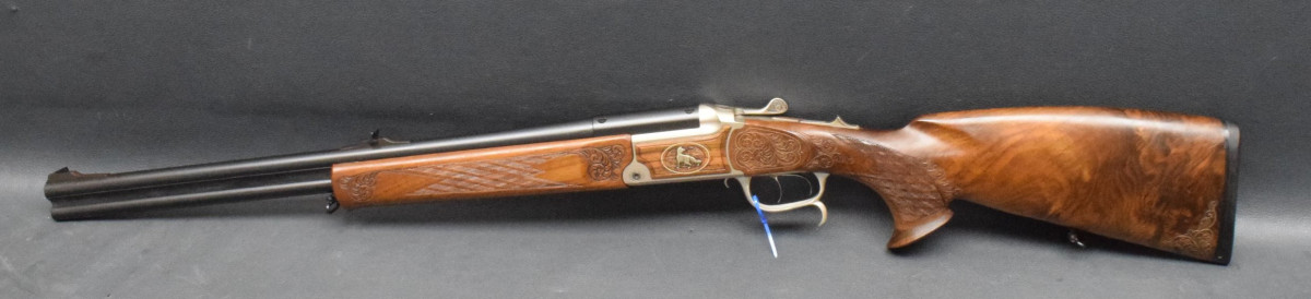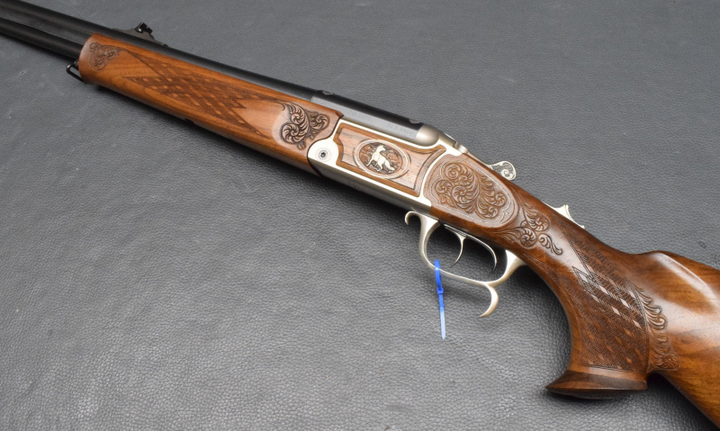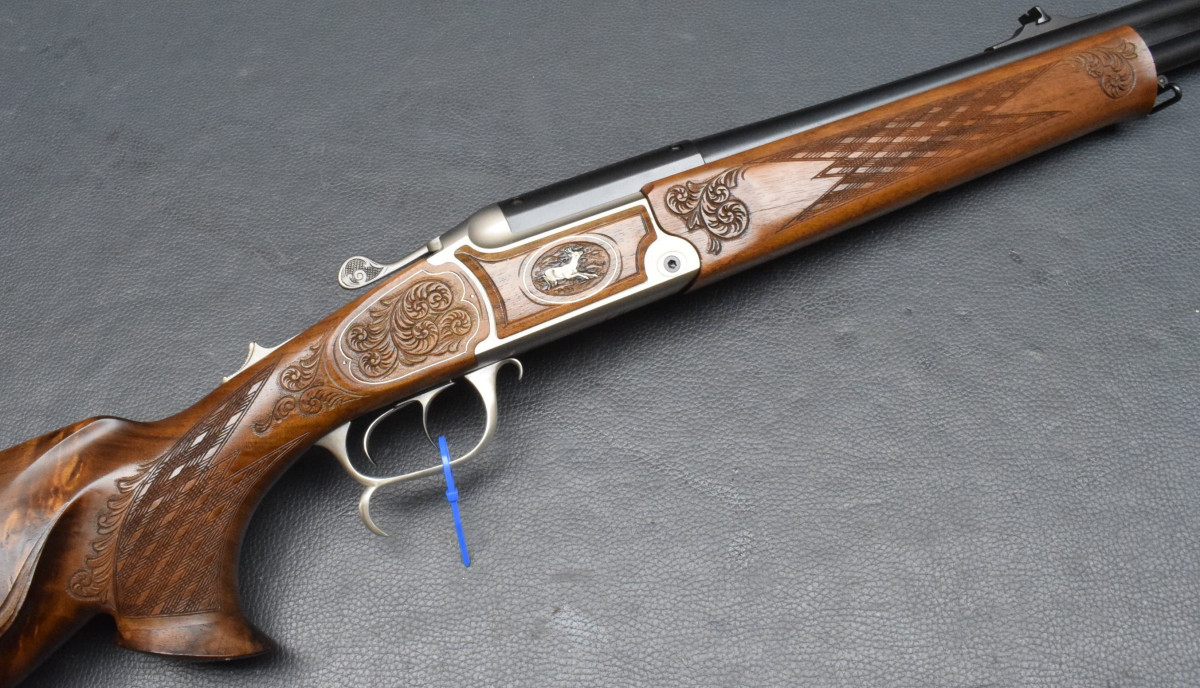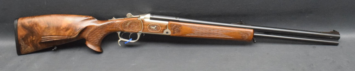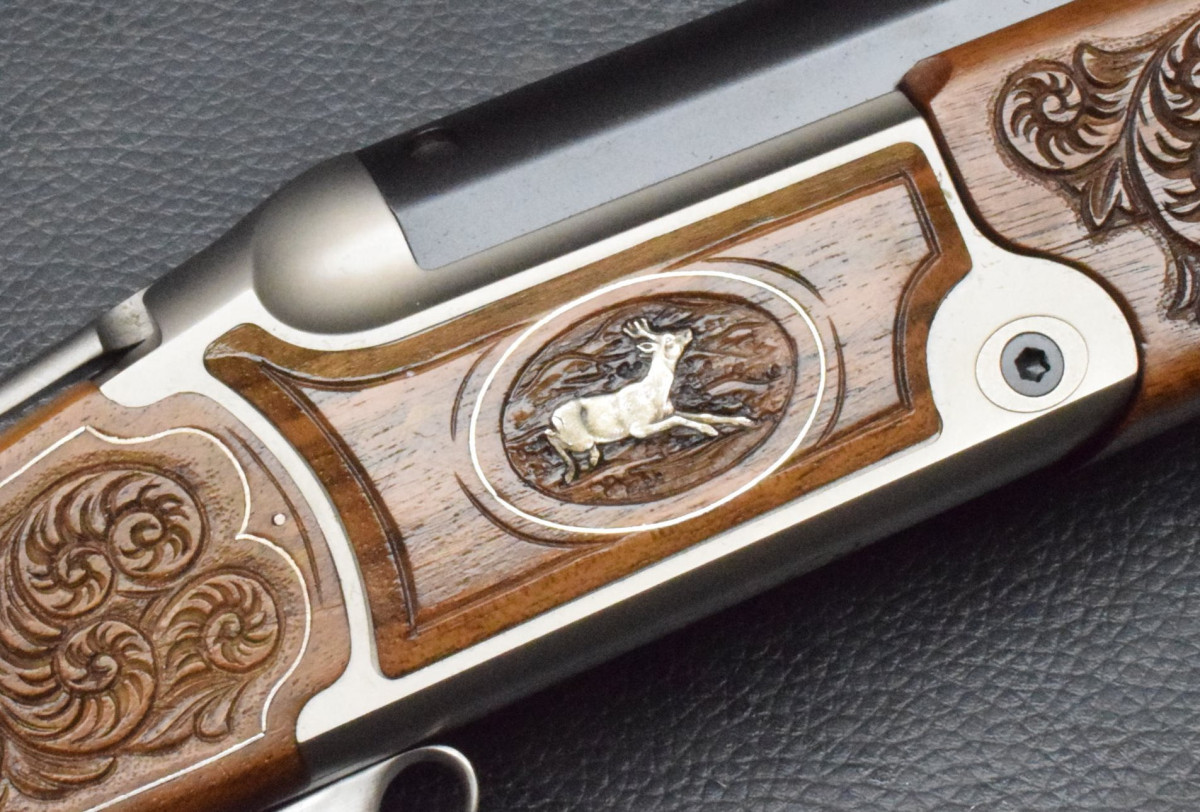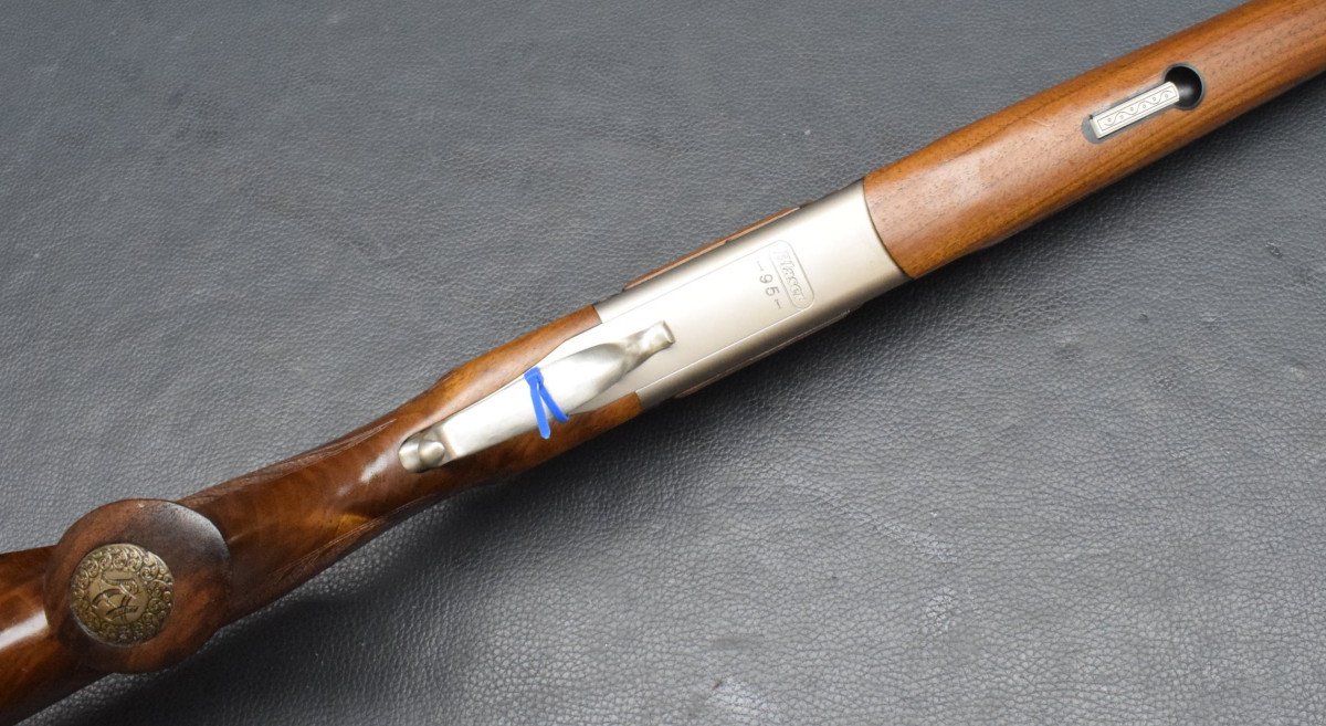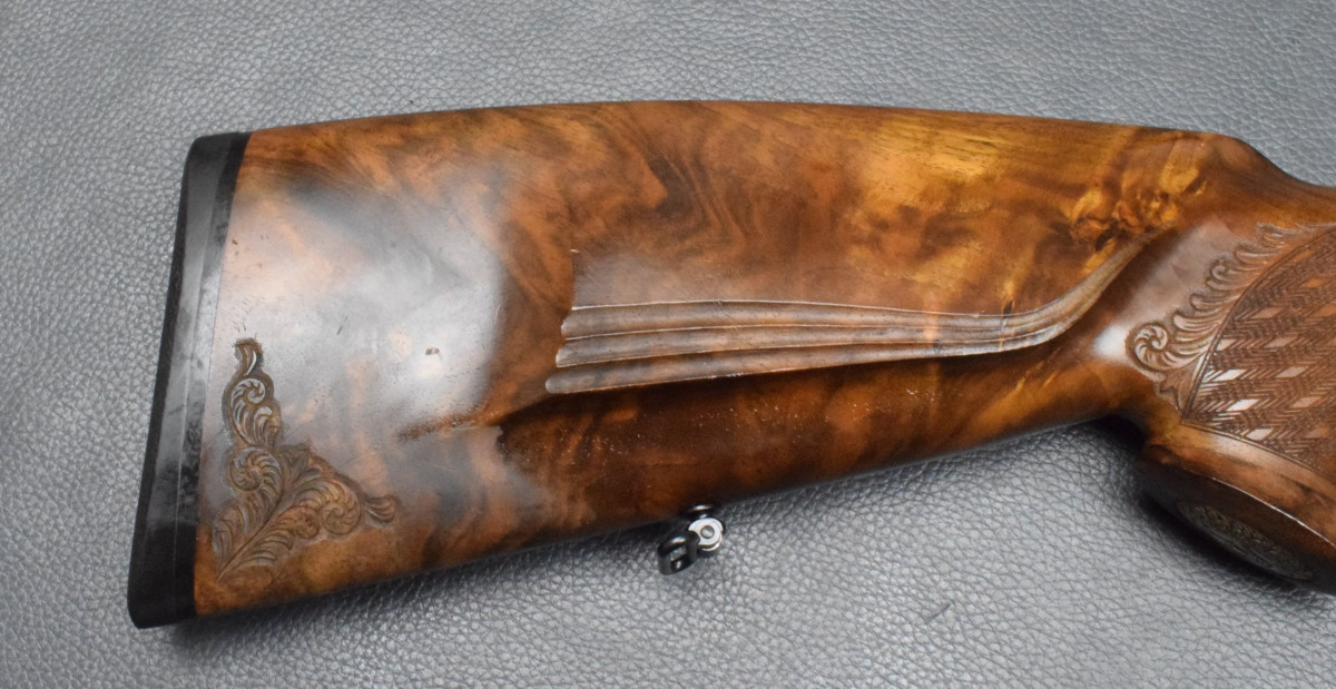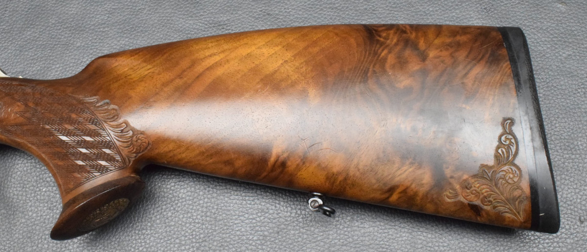 Doppelabzug, Spannschieber auf dem Kolbenhals, Nußbaumschaft mit deutscher Backe, Gummischaftkappe und Riemenbügeln.