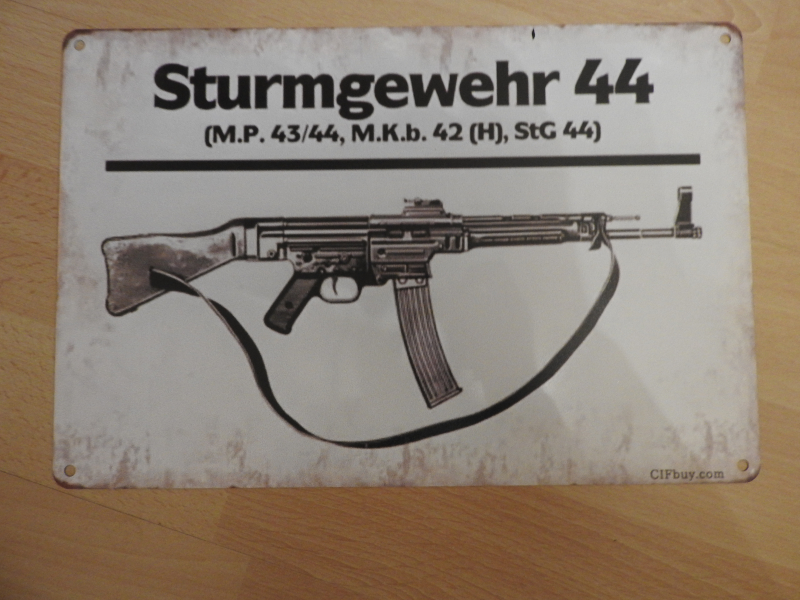 Biete zur Auktion ein Blech-Dekoschild mit Abbildung des Sturmgewehrs StG 44. Das Schild hat die Maße 20 x 30 cm ,hat abgerundete Ecken mit Bohrungen zur Befestigung. Wahrscheinlich ist das Schild im Siebdruckverfahren gefertigt. Herkunft und Alter sind mir nicht bekannt.